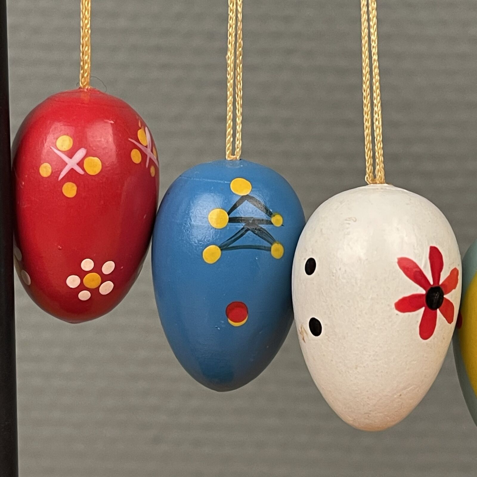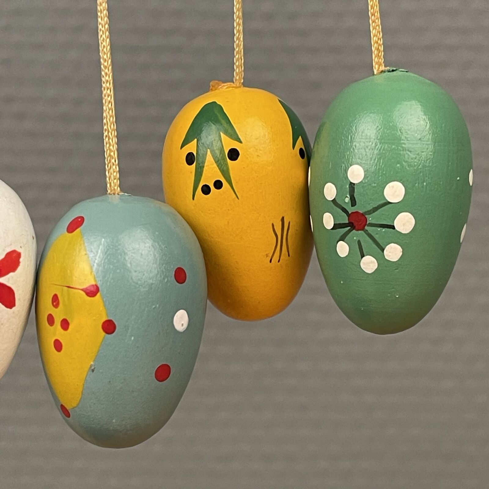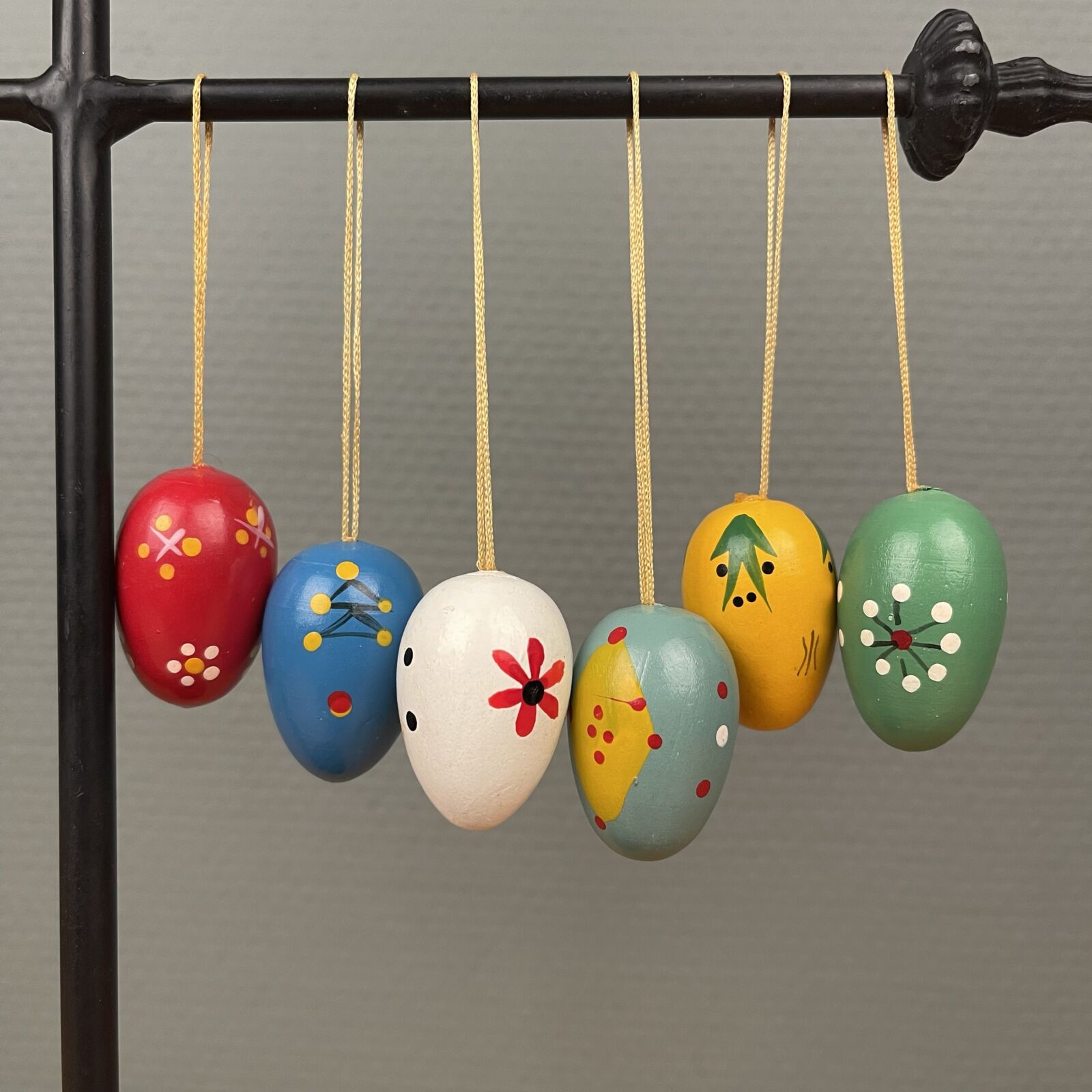 6 smukke gamle Eigenbrod håndmalede træ påskeæg til ophæng. +/- 3,5cm.