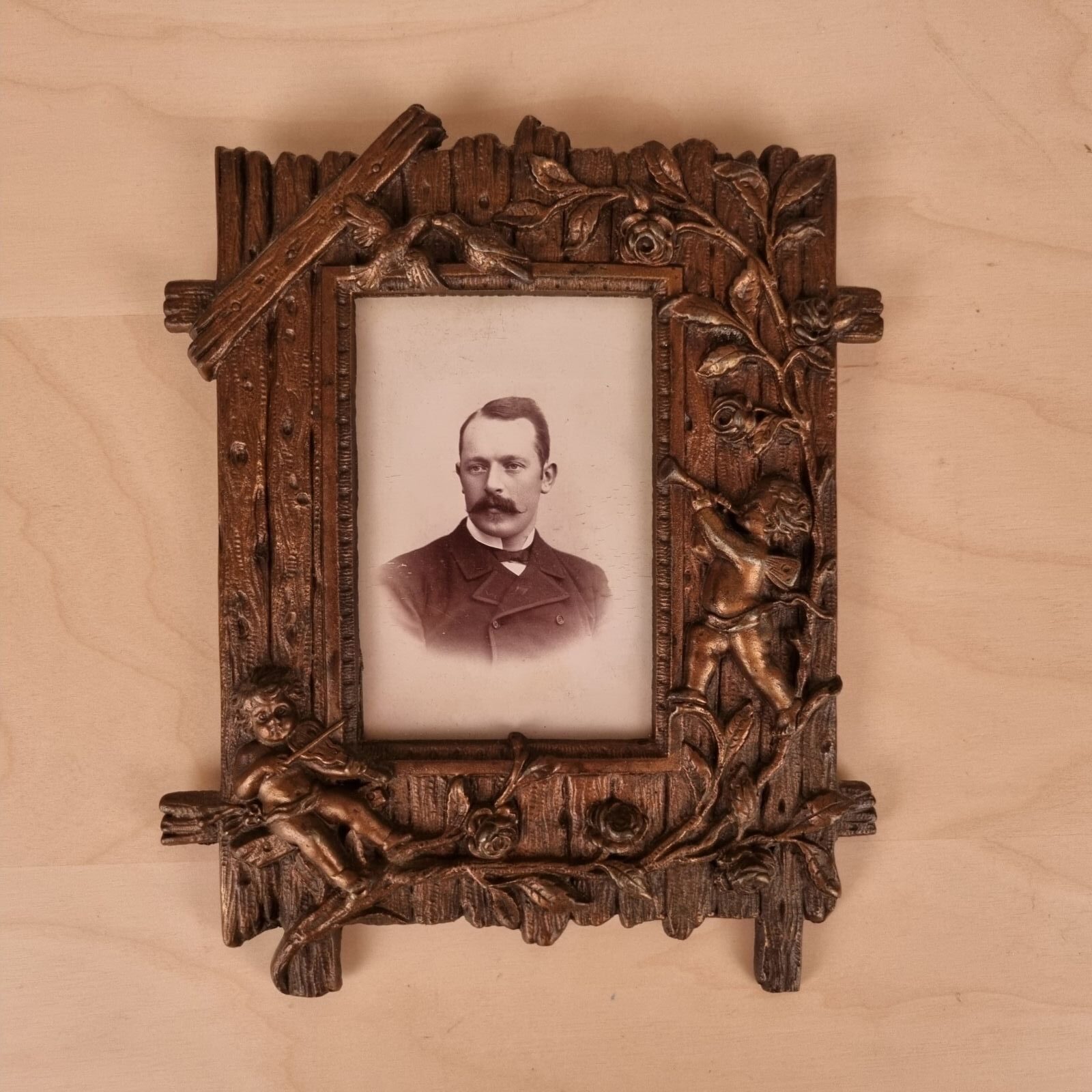 Rammen måler 16,5×14 cm, og hullet til billedet er cirka 6×8,5 cm.