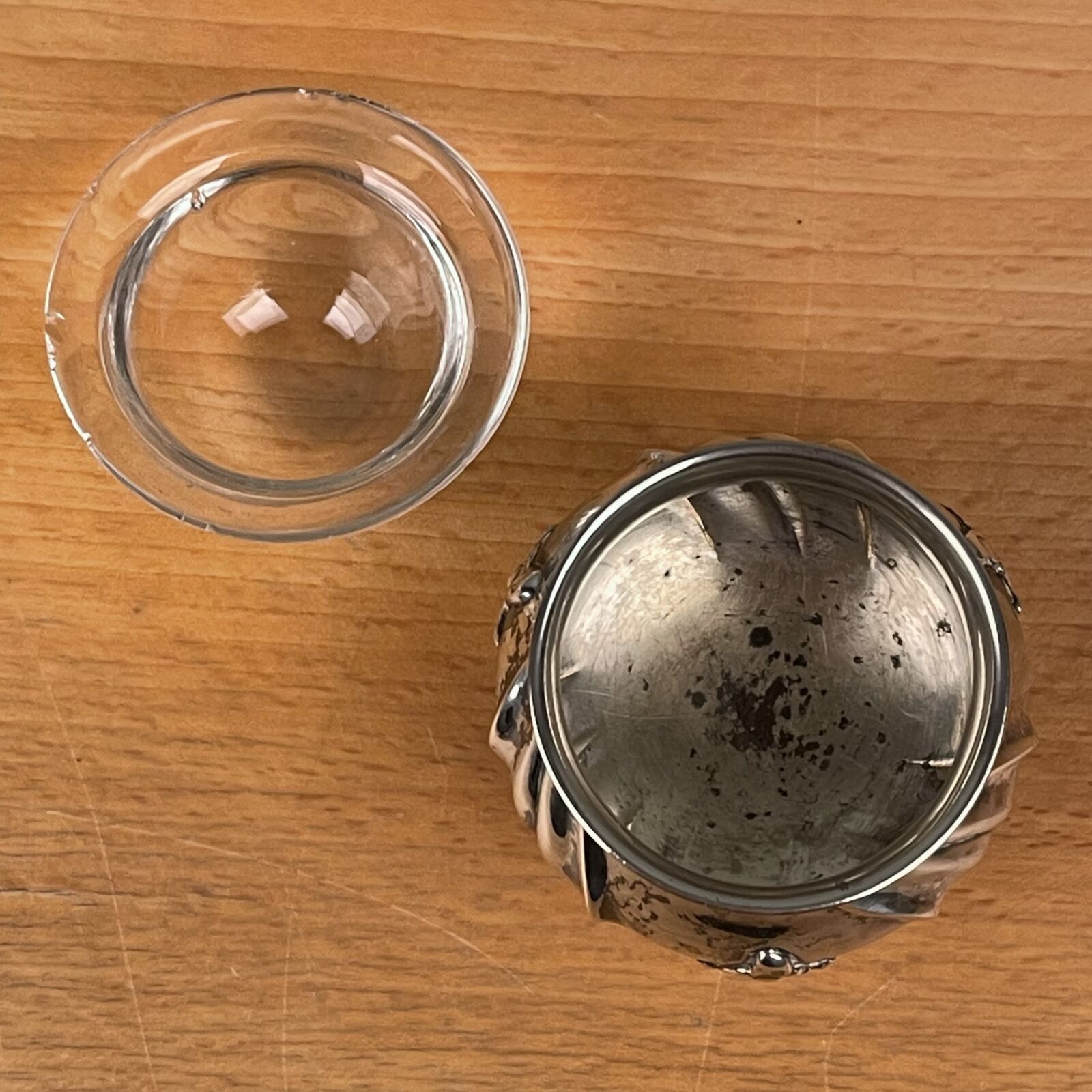 Antikt saltkar i sølv (830) med små glasskåle (småhak i glasskål). På tre små fødder. 4,8cm høj.
