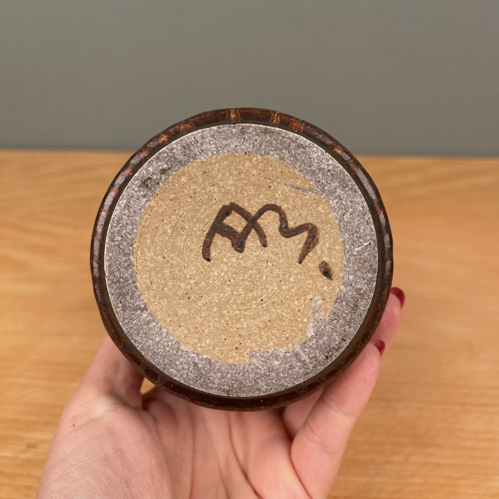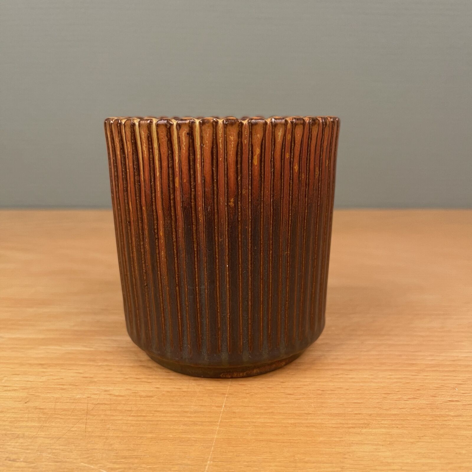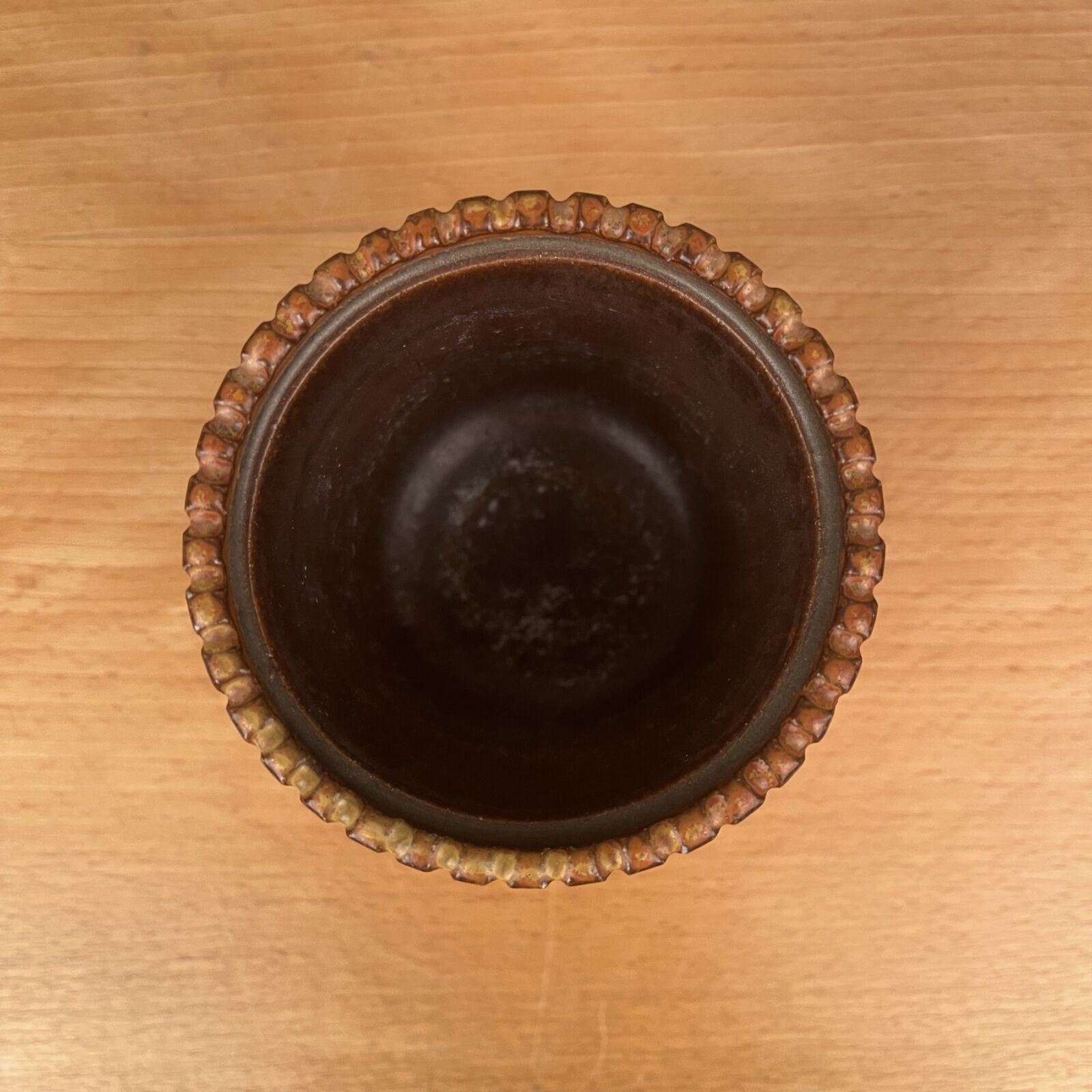 Vanvittig smuk krukke uden låg af Arne Bang. Brune jordfarver. Fremstår fejlfri. Kan med fordel bruges som lille vase. 9cm høj. 8,5cm Ø.