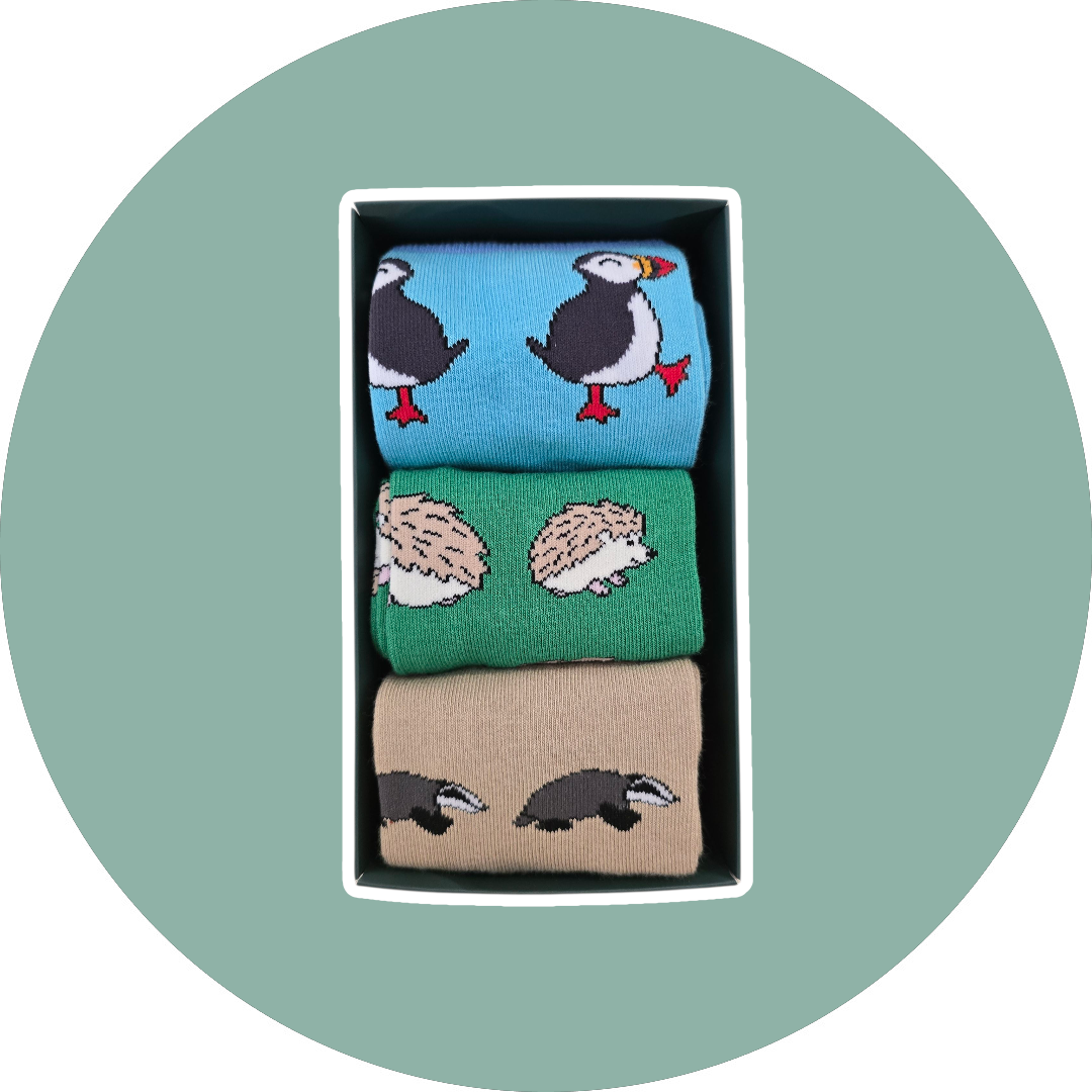 BARE KIND voksen sokker med dyr – 3pak Søpapegøje, Pindsvin og Grævling.