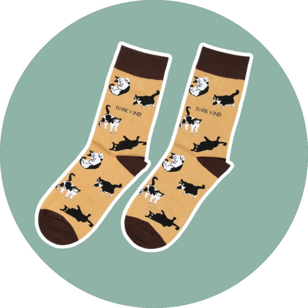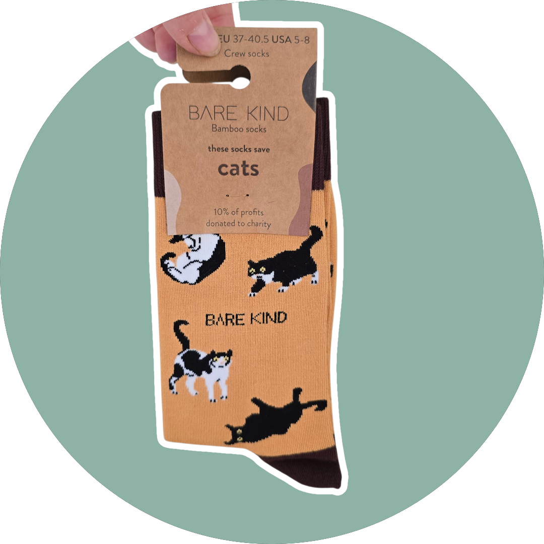 ‘Vores bambussokker til voksne er af god kvalitet, alsidige og komfortable. Disse dyresokker er lavet af plys bambusfibre og kommer med flotte mønstre og muntre farver, der med garanti får ethvert outfit til at springe ud. De er luksuriøst bløde, varmere end bomuldsstrømper, åndbare, svedtransporterende og antibakterielle. Snup dig et par, og vi donerer 10 % af overskuddet til at redde dyret på dine sokker.’ Bare Kind.