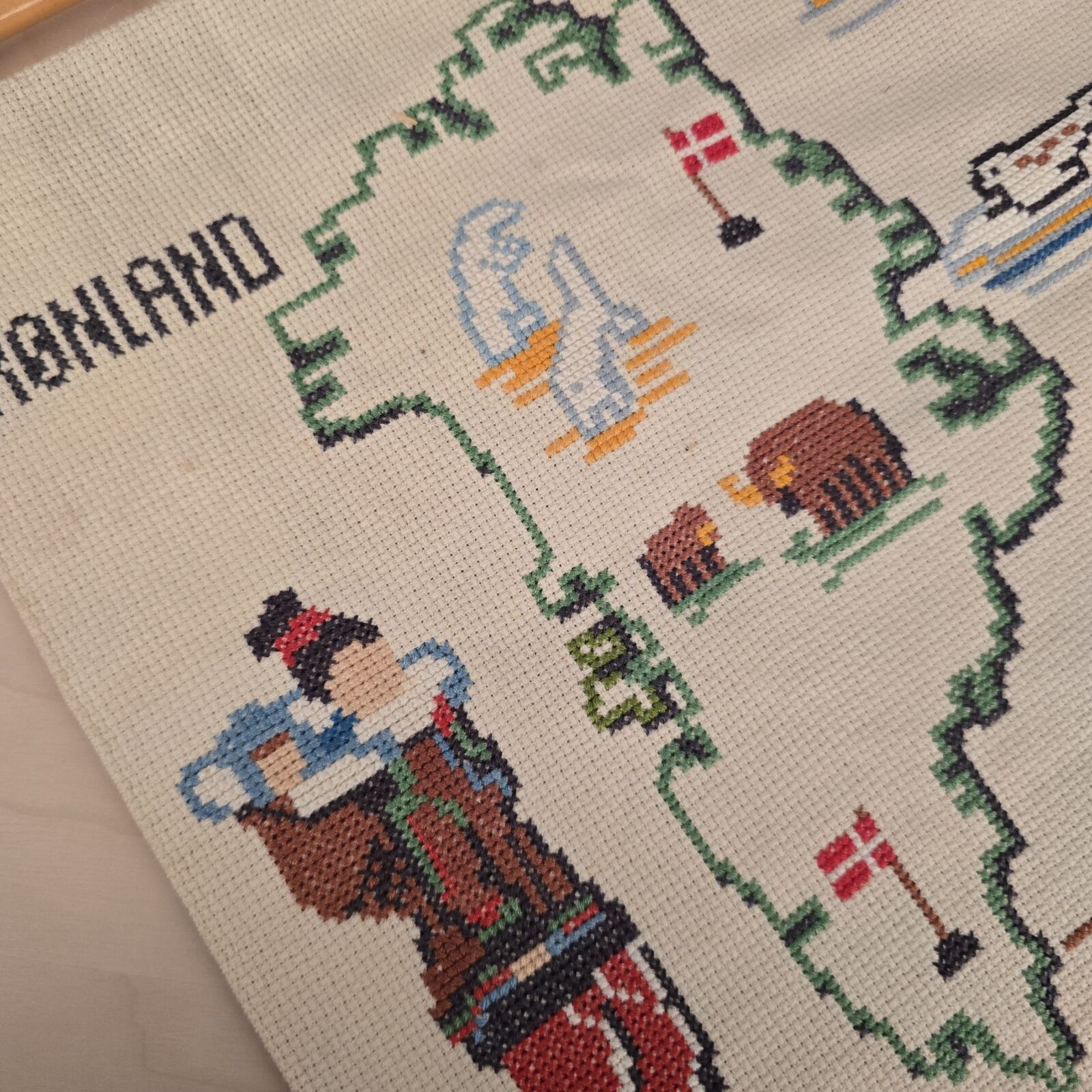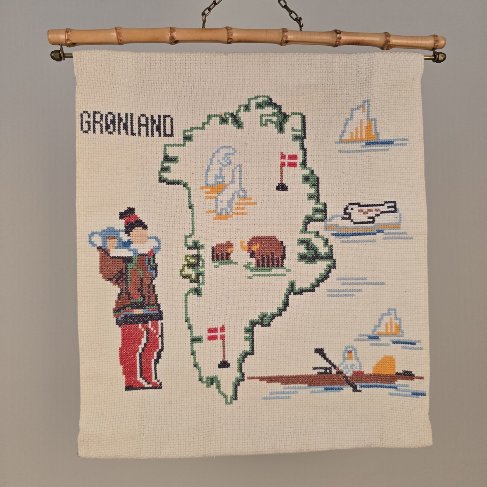 Broderi til ophæng – motiver fra Grønland. 30x35cm. Har få brugsspor.