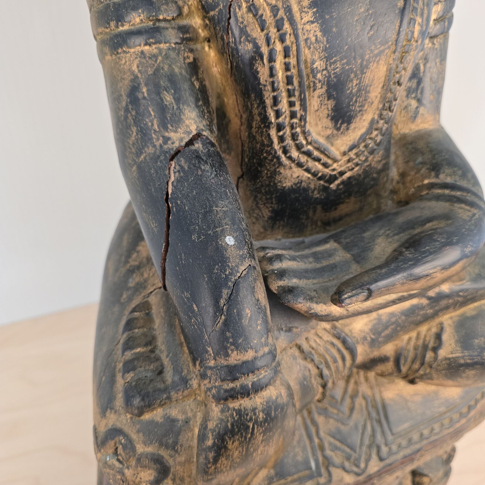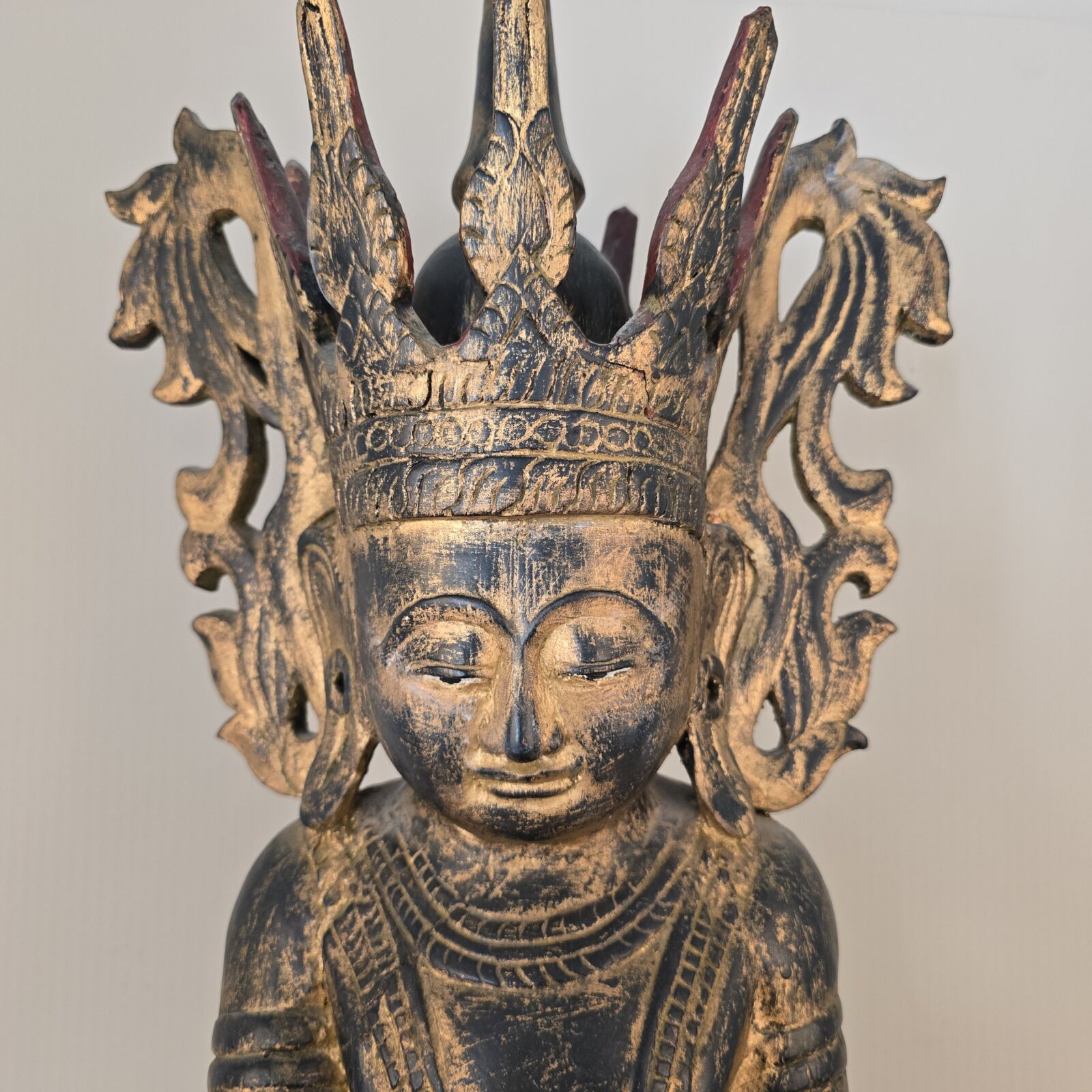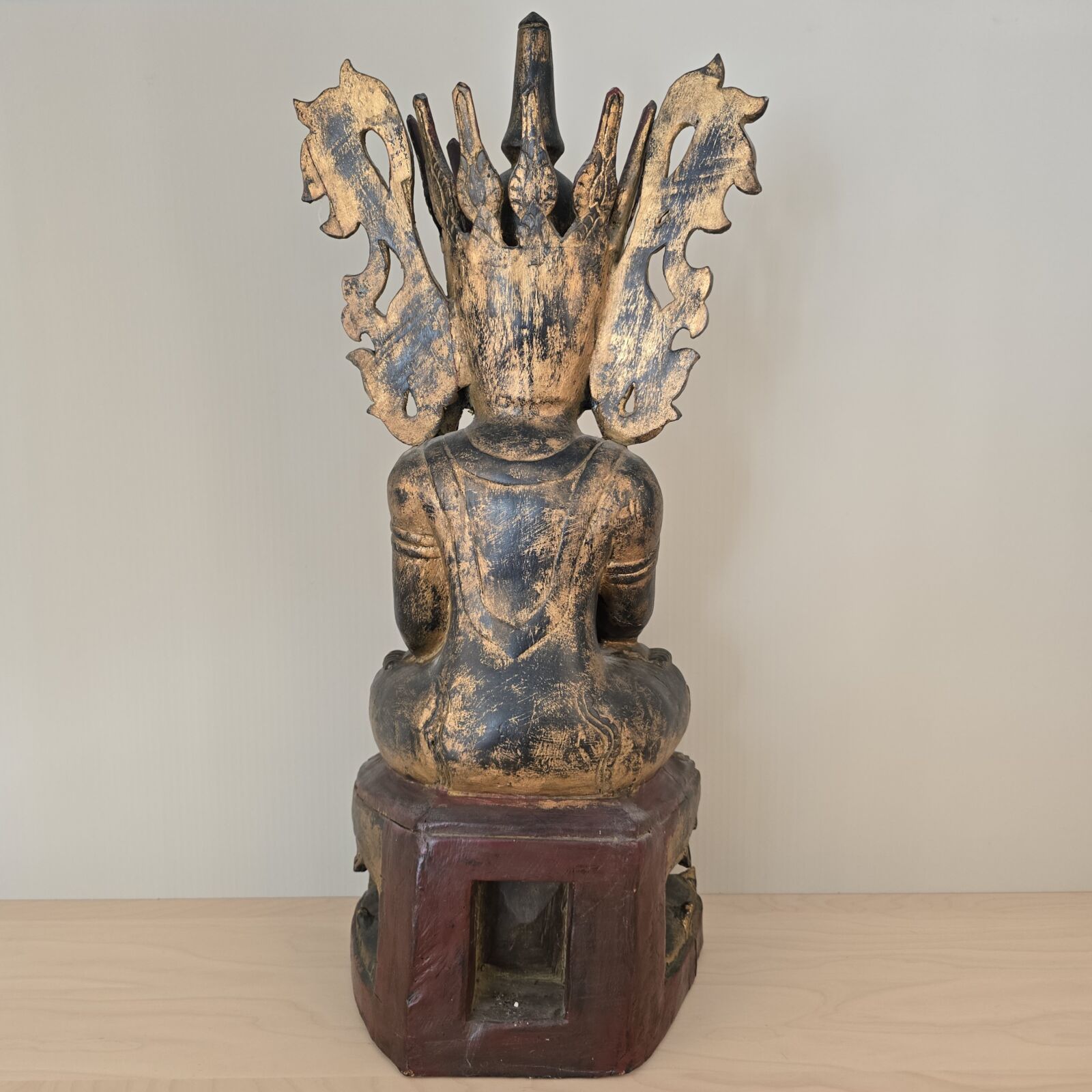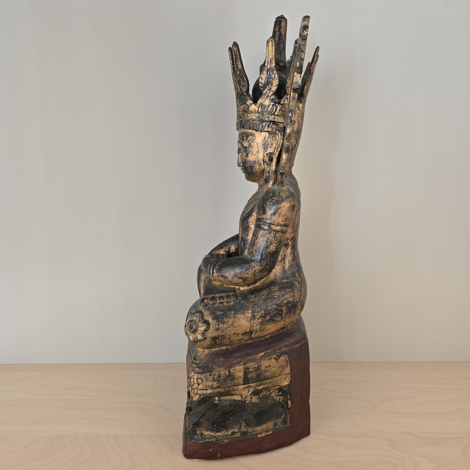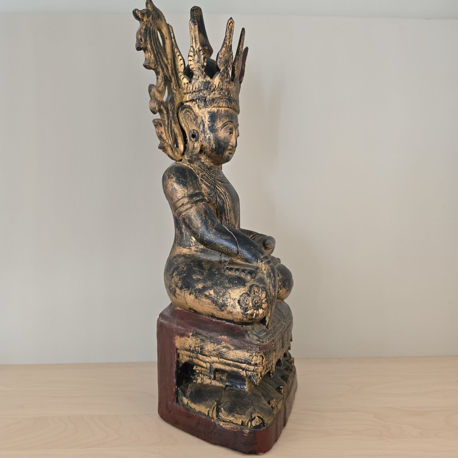 Smuk Jambhupati Buddha i bemalet træ. Antagelig fra Burma. 19’/20′ århundrede. 74cm høj. Har aldersrelateret brugsspor.