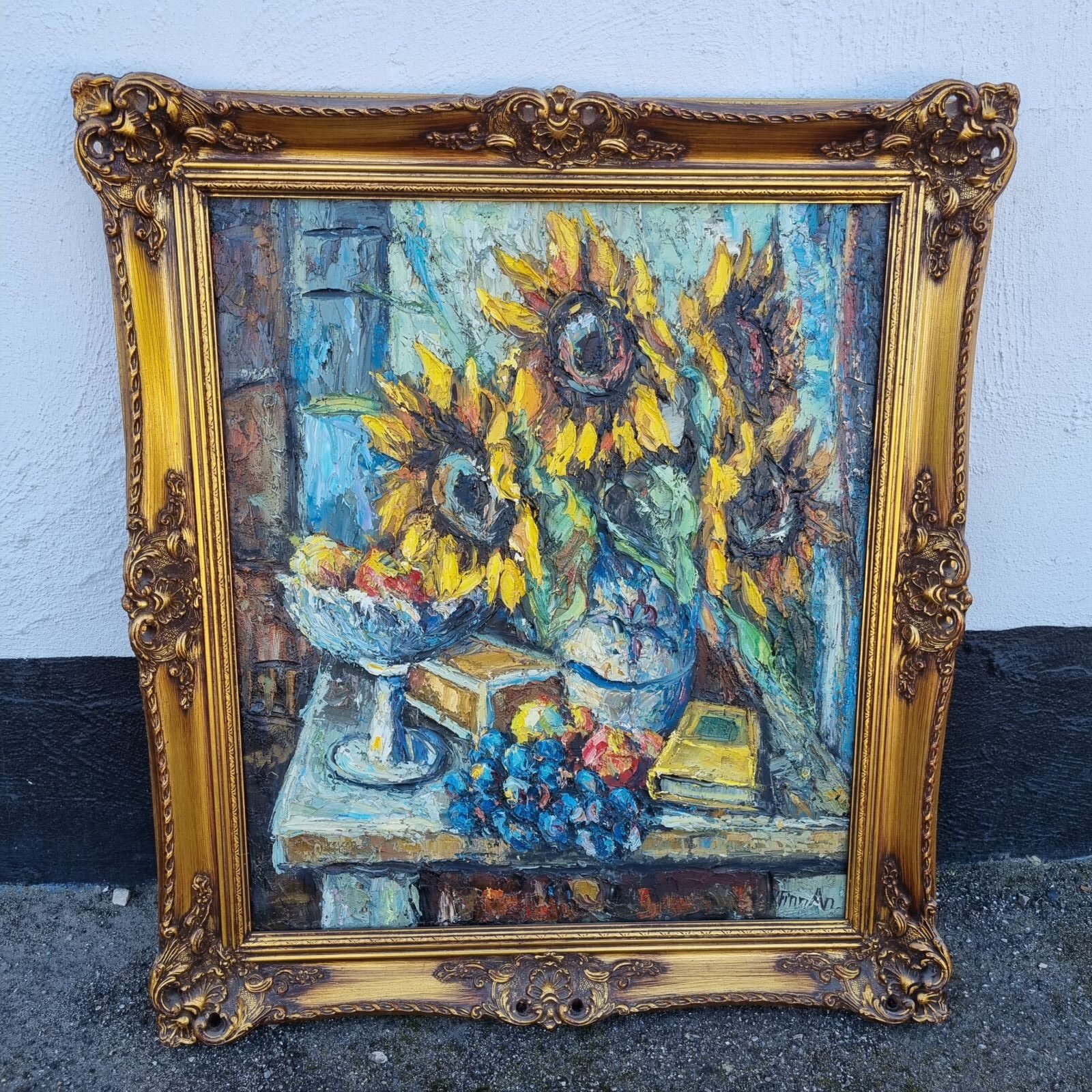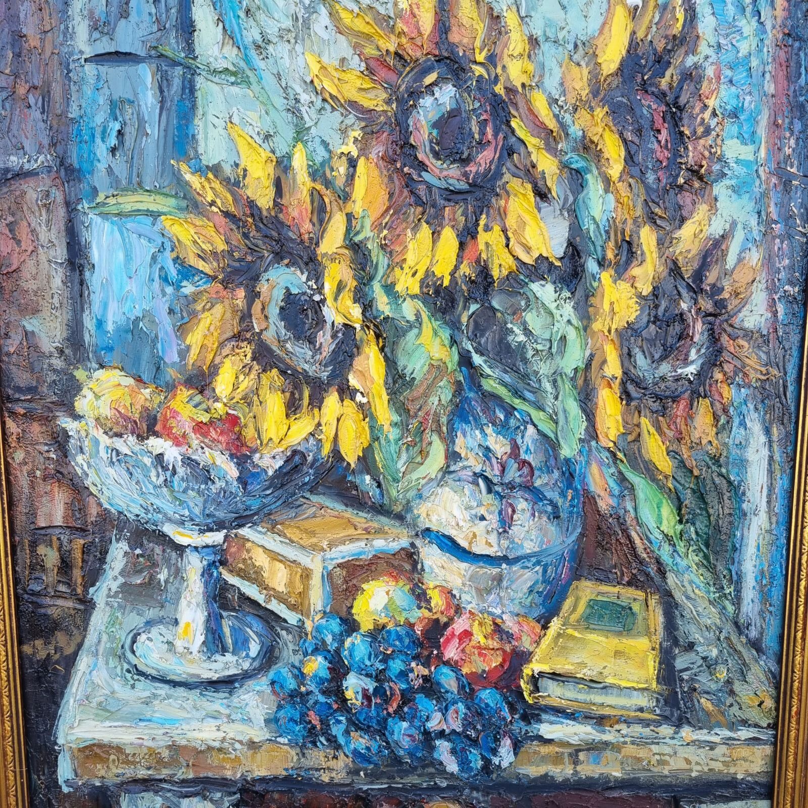 Motiv af bord med solsikker, opsats m.m.