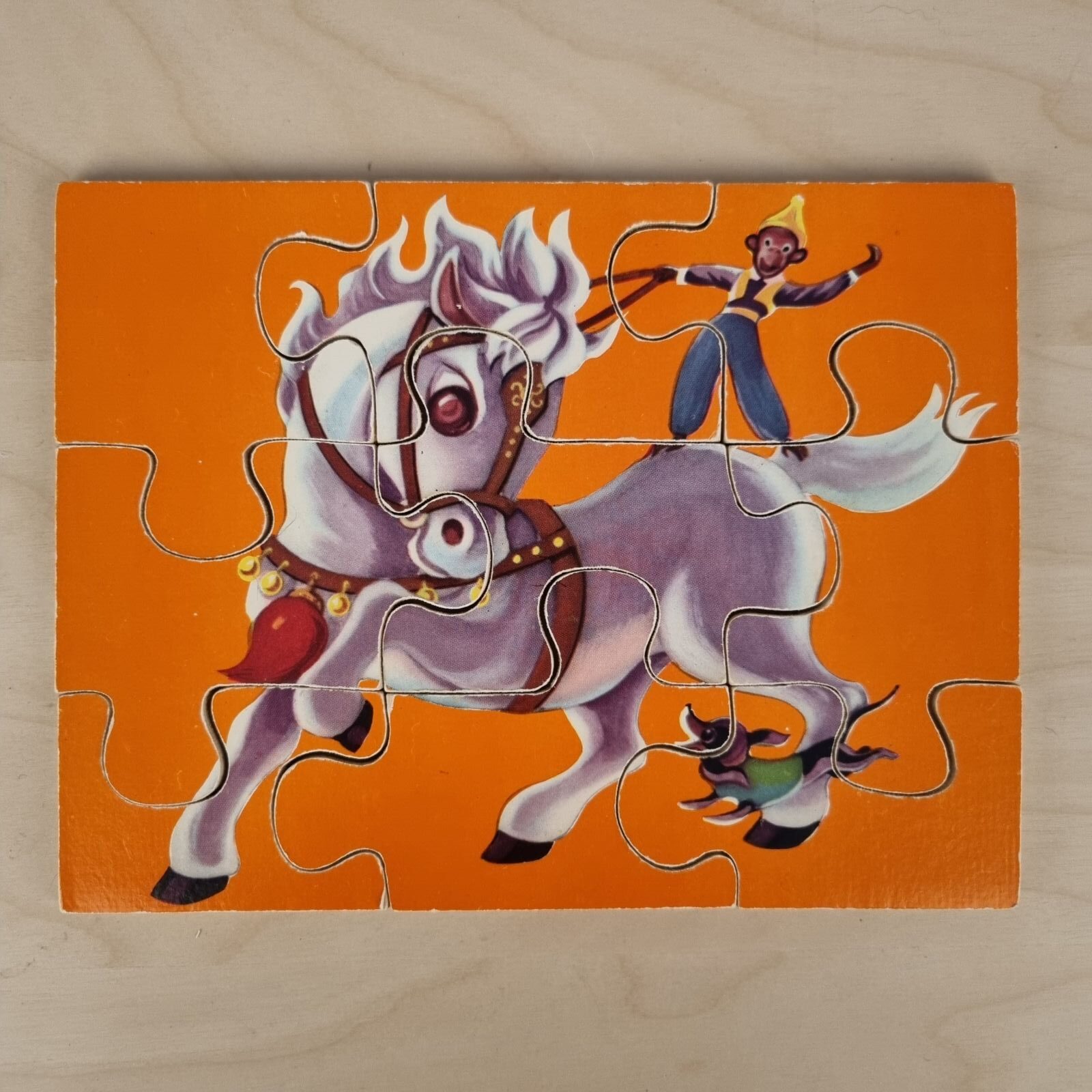 Fint gammelt puslespil i træ med motiv af cirkushest og abe.
