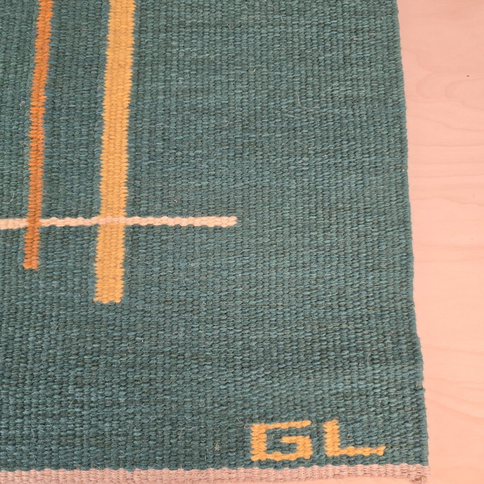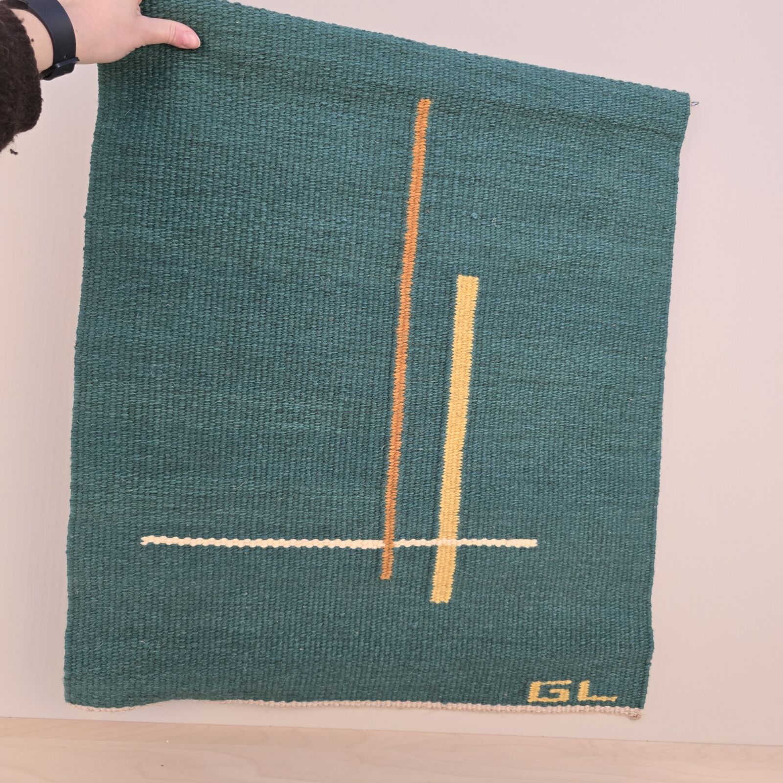 Gertie Lundberg ‘Linjer’ vægtæppe 67x58cm. Smukt håndvævet vægtæppe. Velholdt og intakt. Grøn bagrund/ gule striber. Modernistisk mønster.