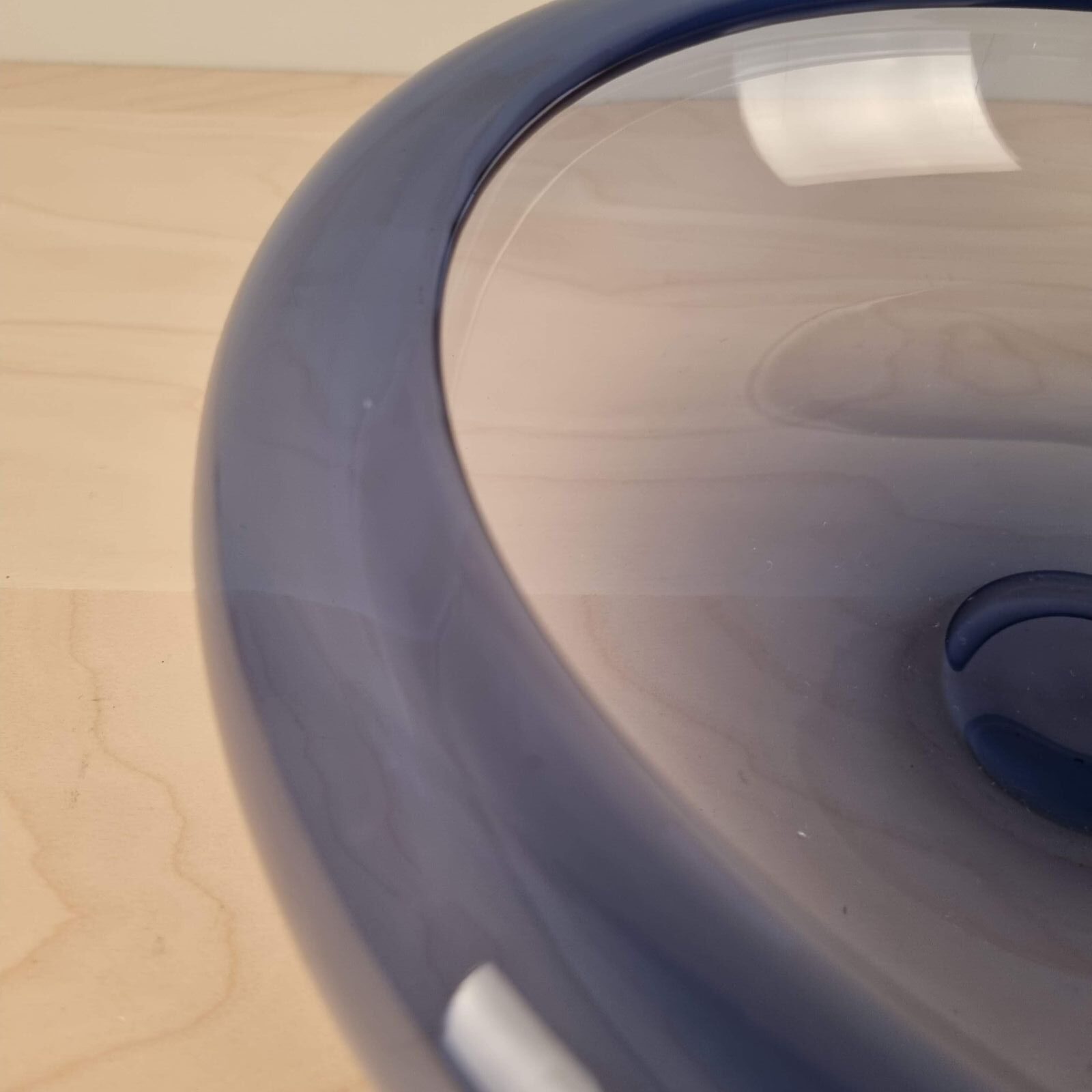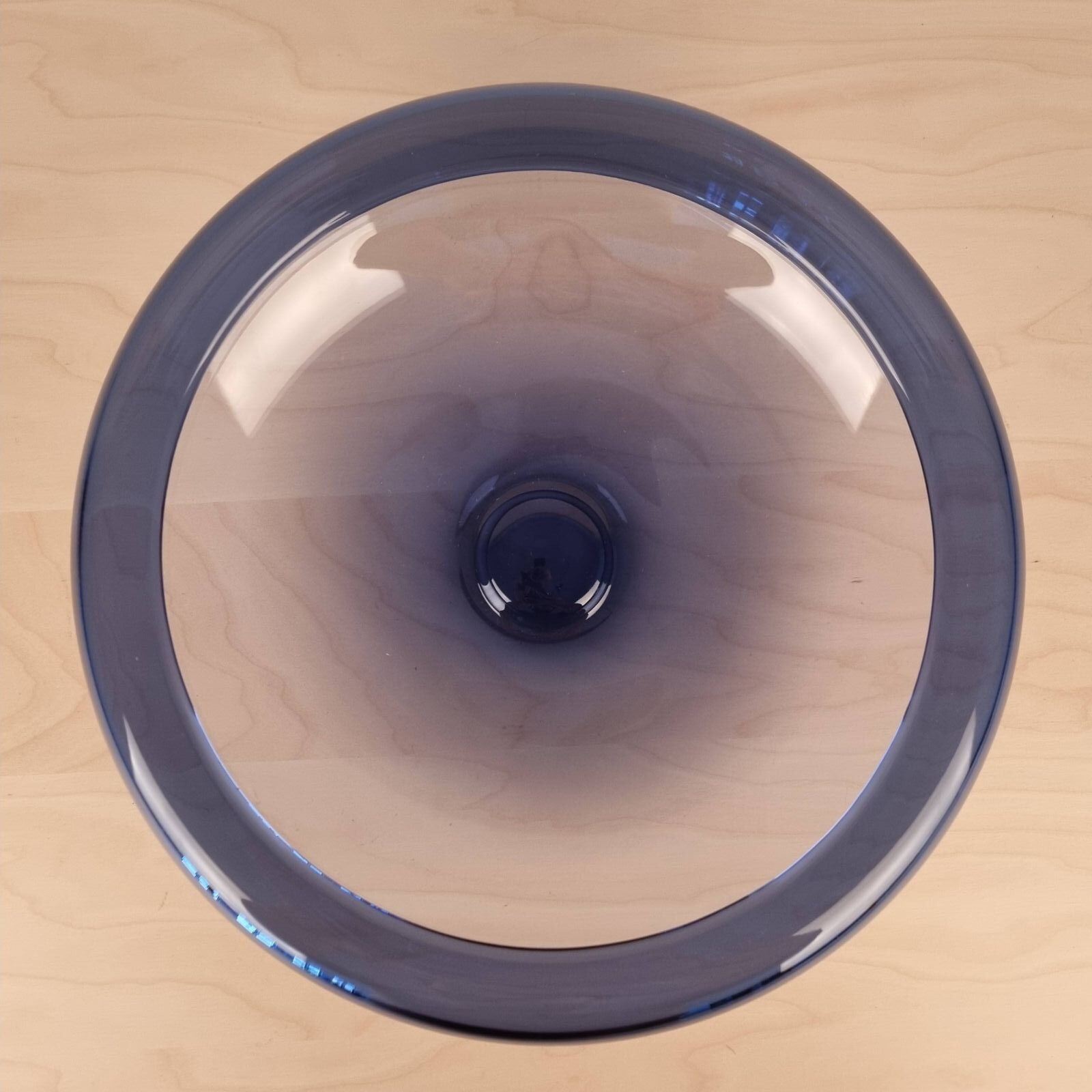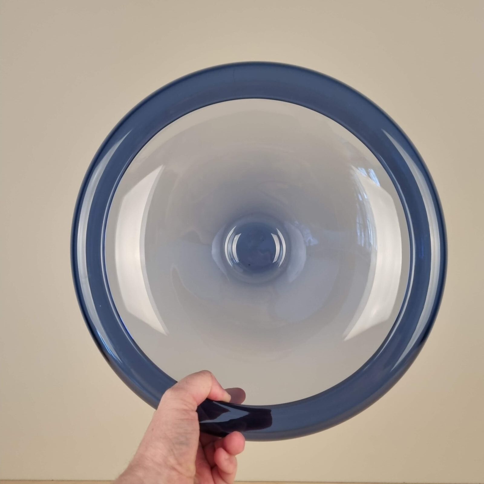Safir-blå og med en diameter på 33 centimeter, samt en højde på 10,5 cm.