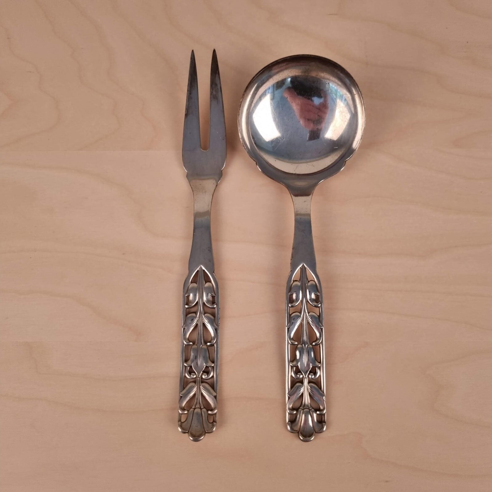 Fint sæt af “tag”-ting – kødgaffel og suppeske/øse i plet fra Frigast.