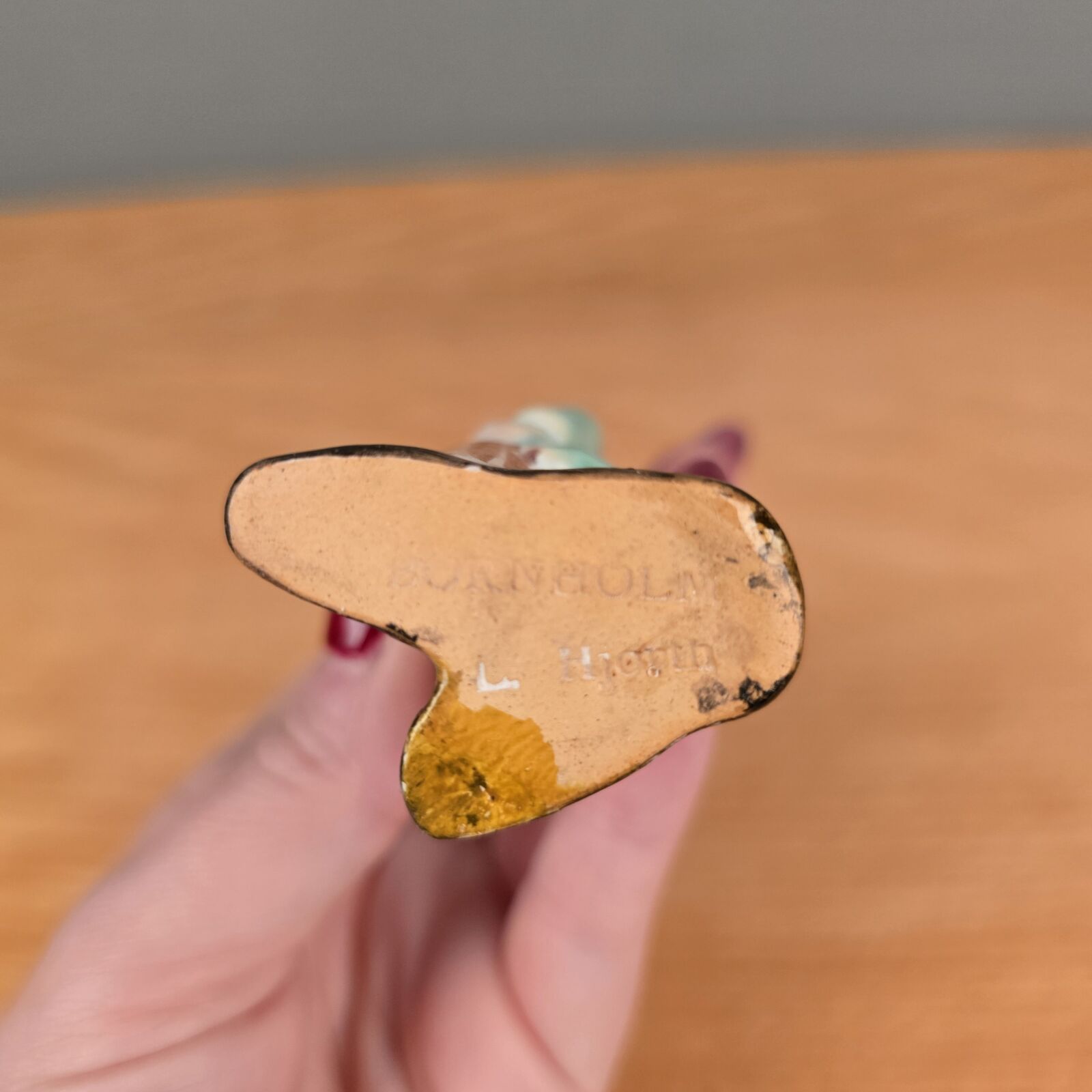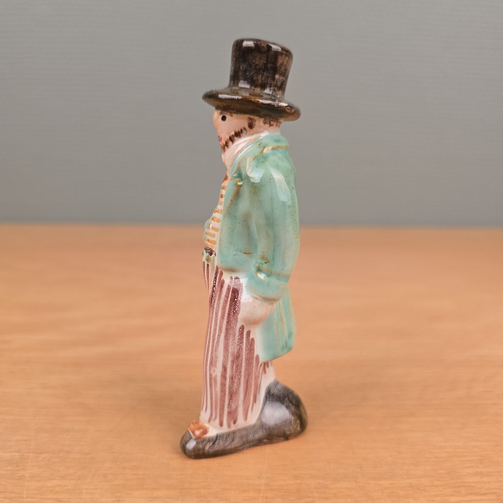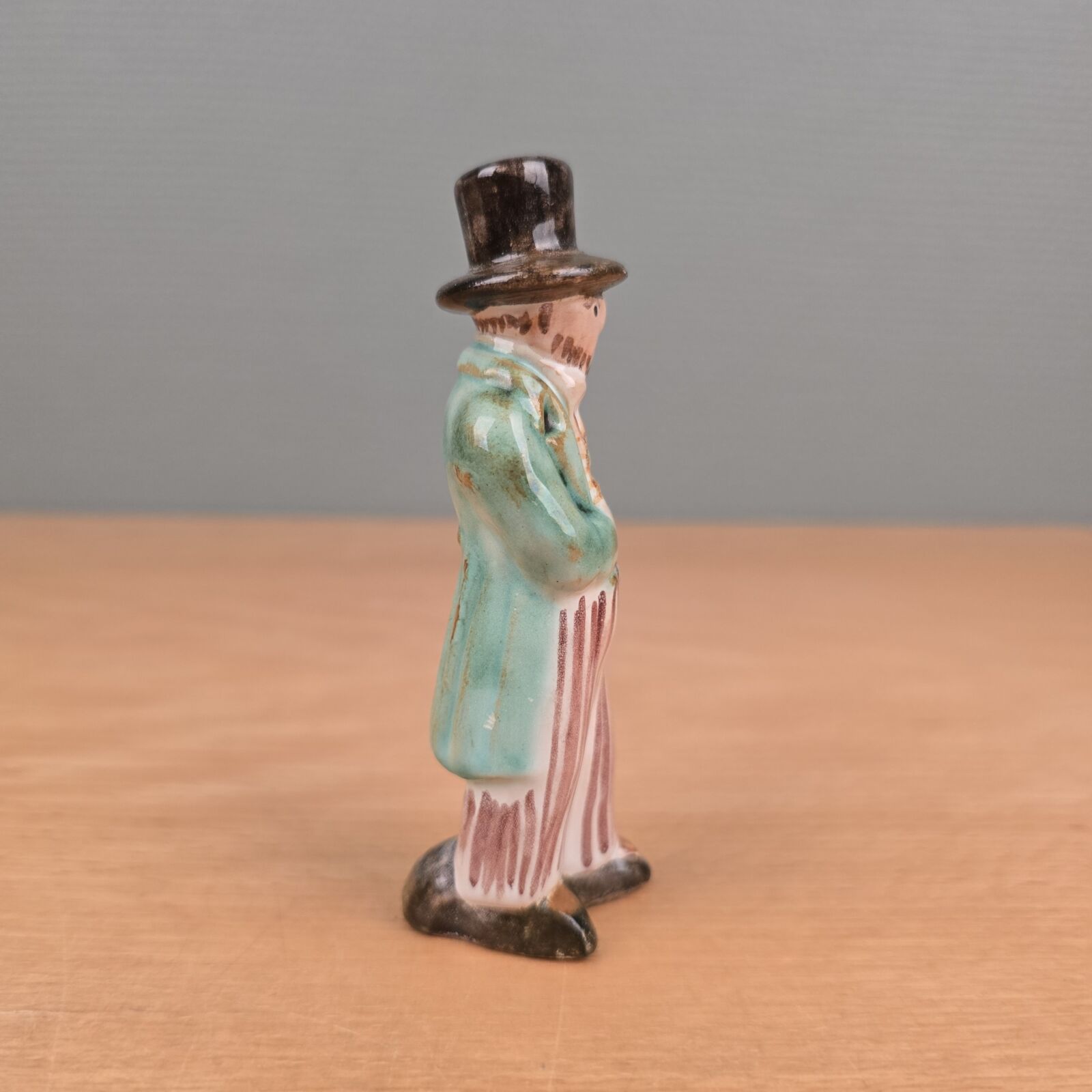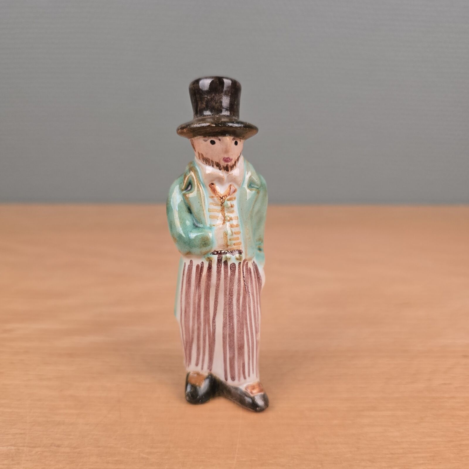 L. Hjorth egnsfigur – mand 10,5cm. Grøn jakke, brun stribet bukser. Stemplet. Har få aldersrelaterede brugsspor.