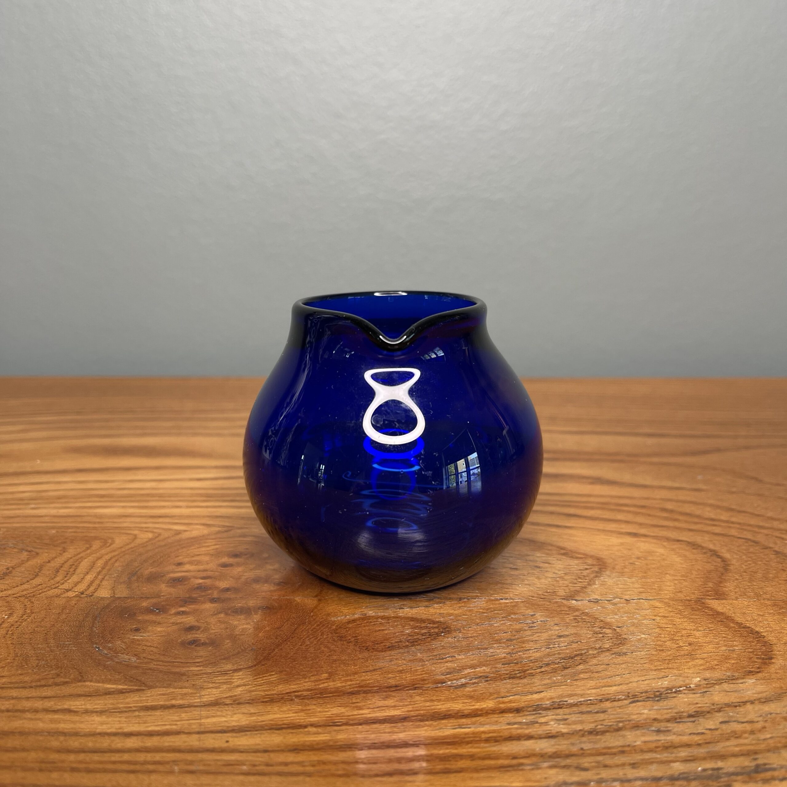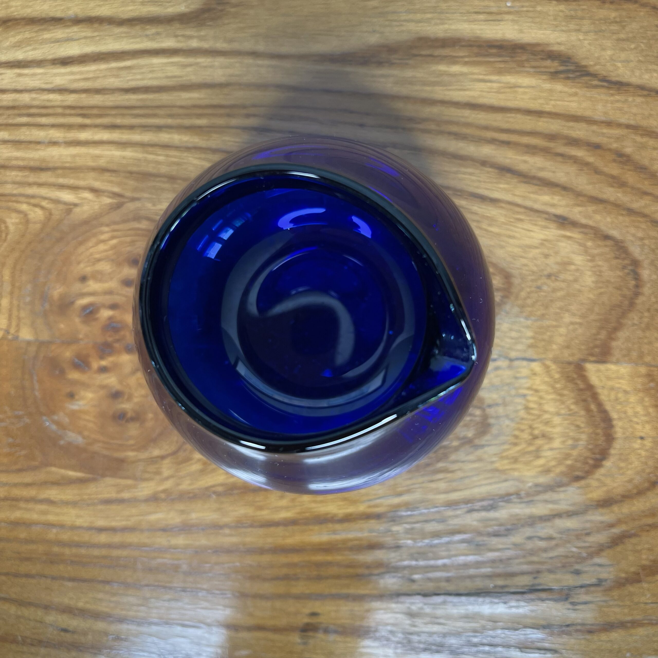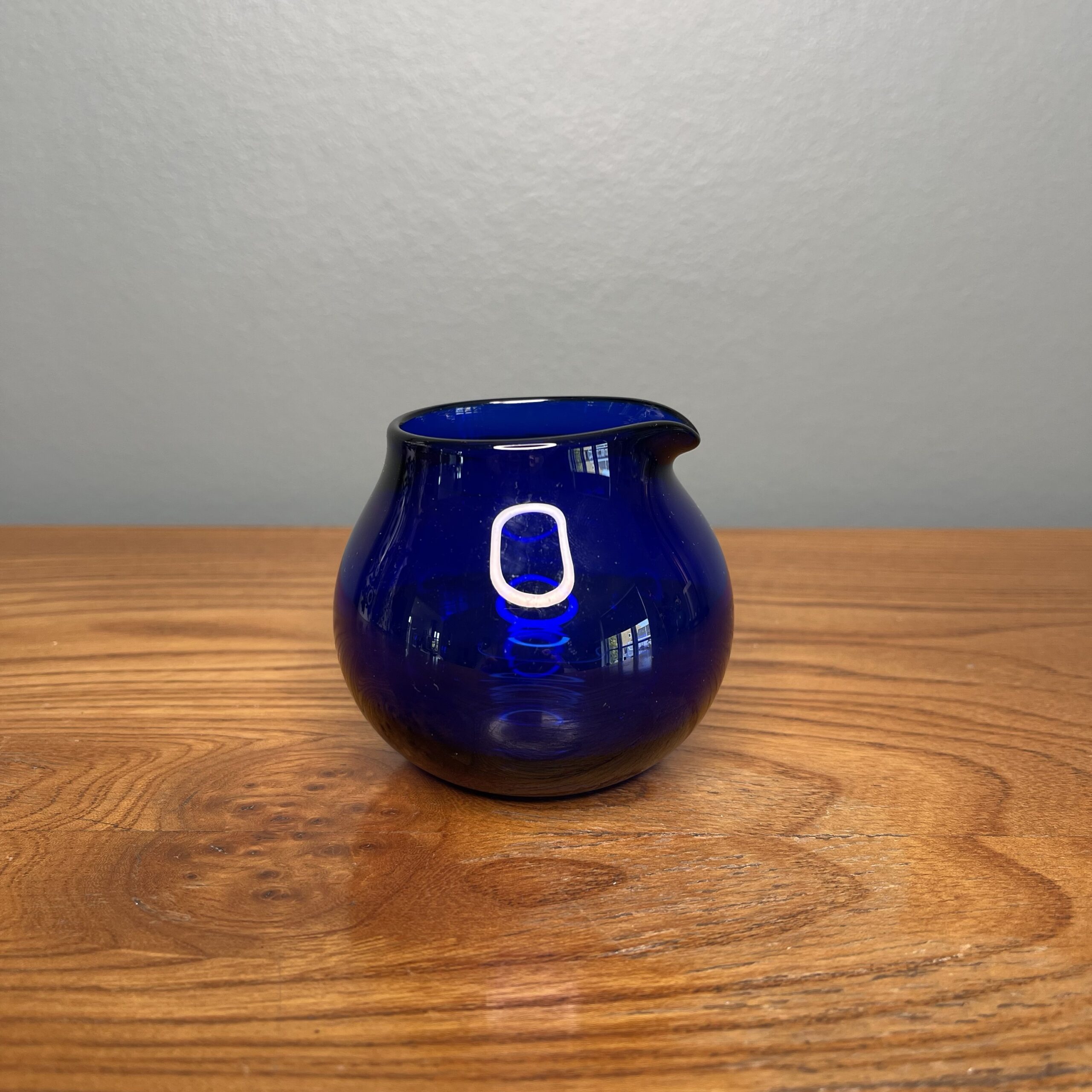 Sød lille buttet glaskande til fløde eller mælk. Dyb blå. 7cm høj. 5cm Ø.