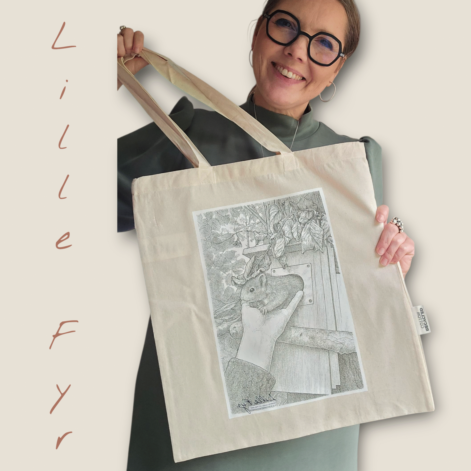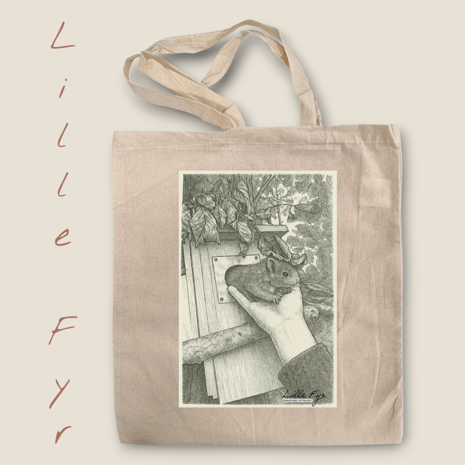 Skøn mulepose med ‘Lille Fyr’s motiv. I 100% genanvendt bomuld. Måler 38x41cm. Hank 28cm.