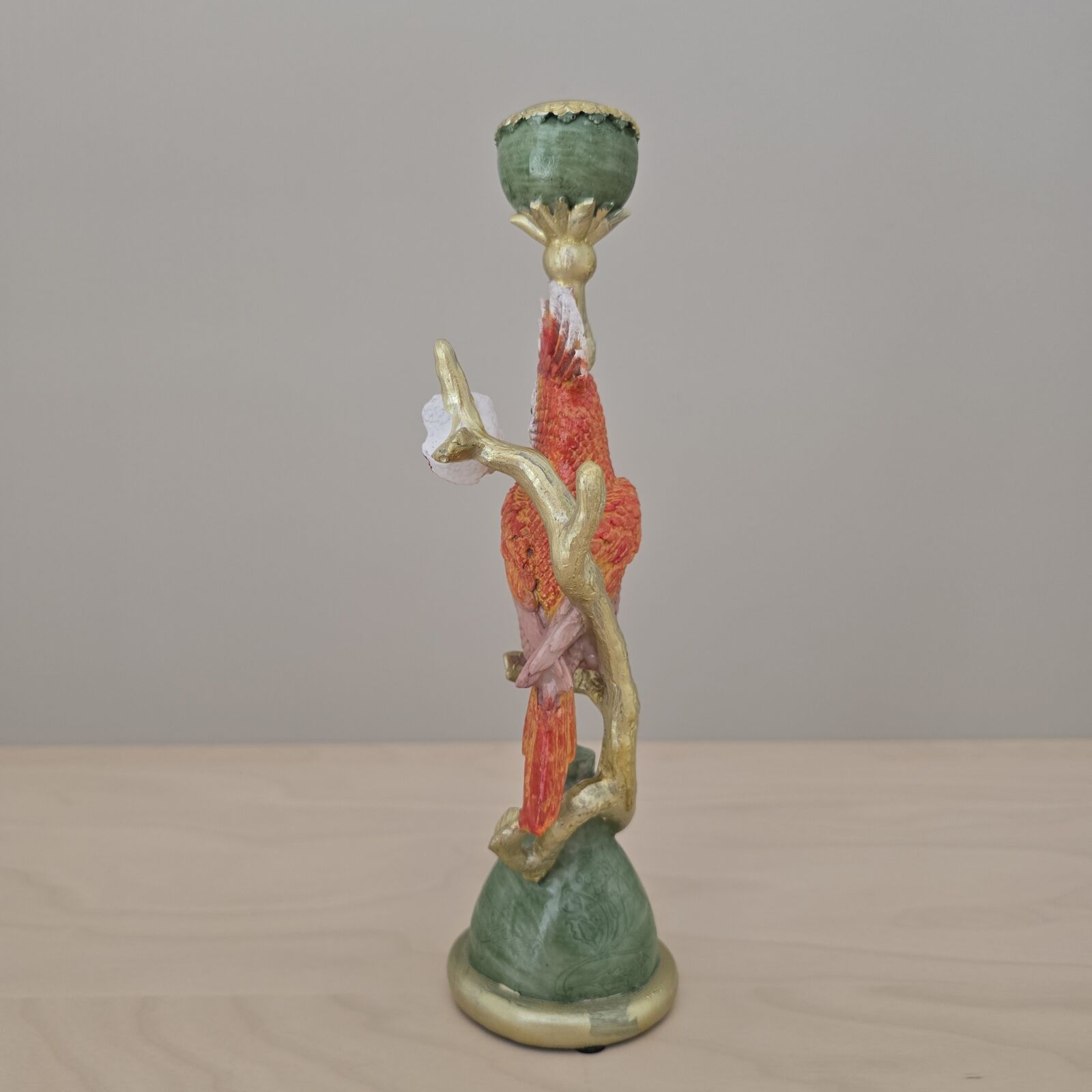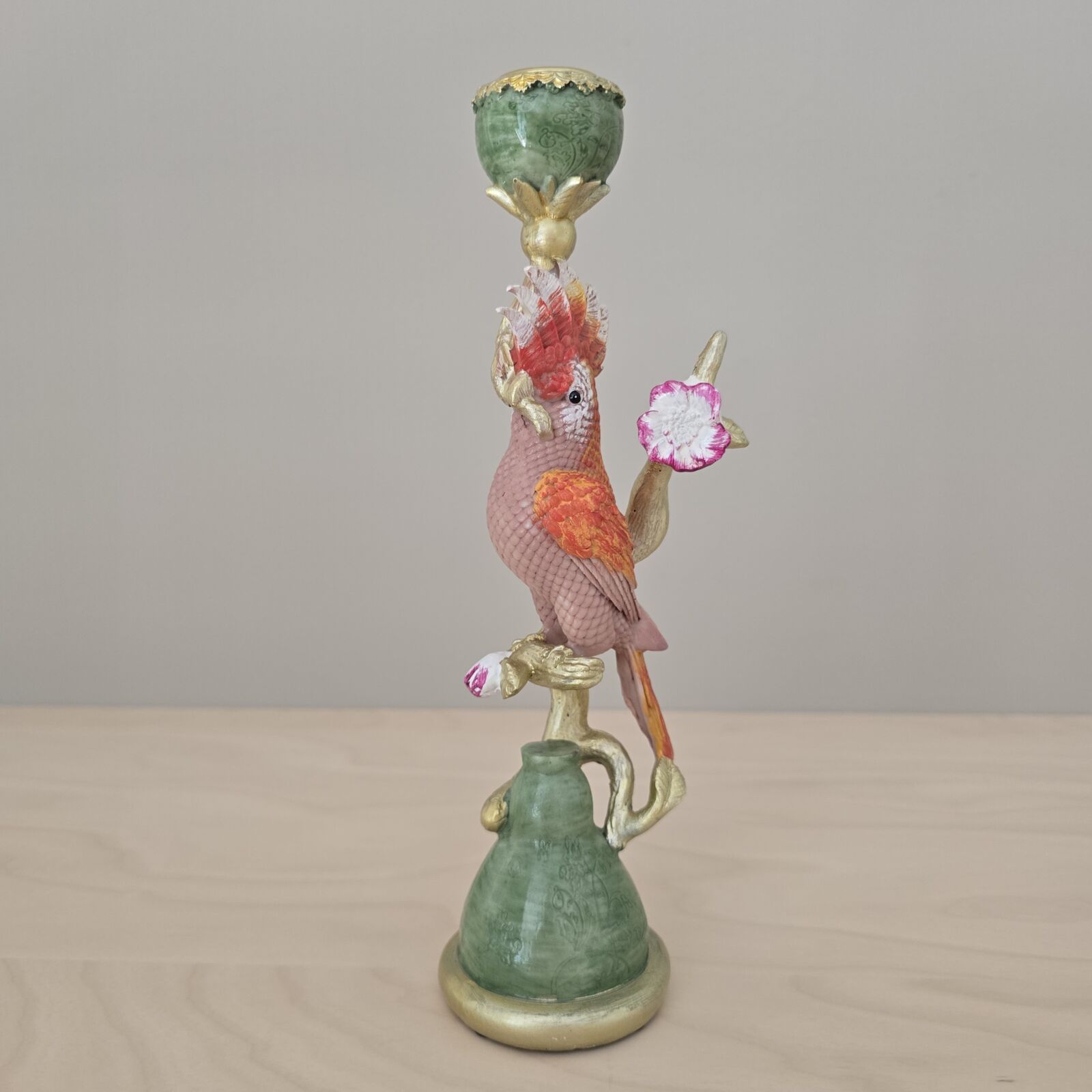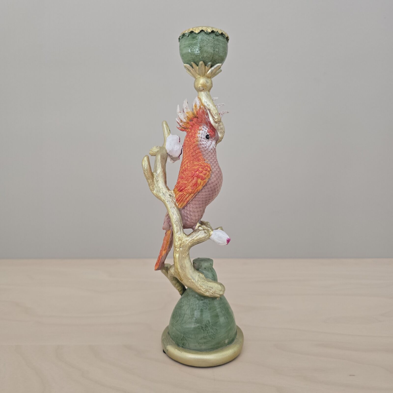 Nyere lysestage med kakadue. Bemalet resin. 23cm høj. Velholdt, som ny.