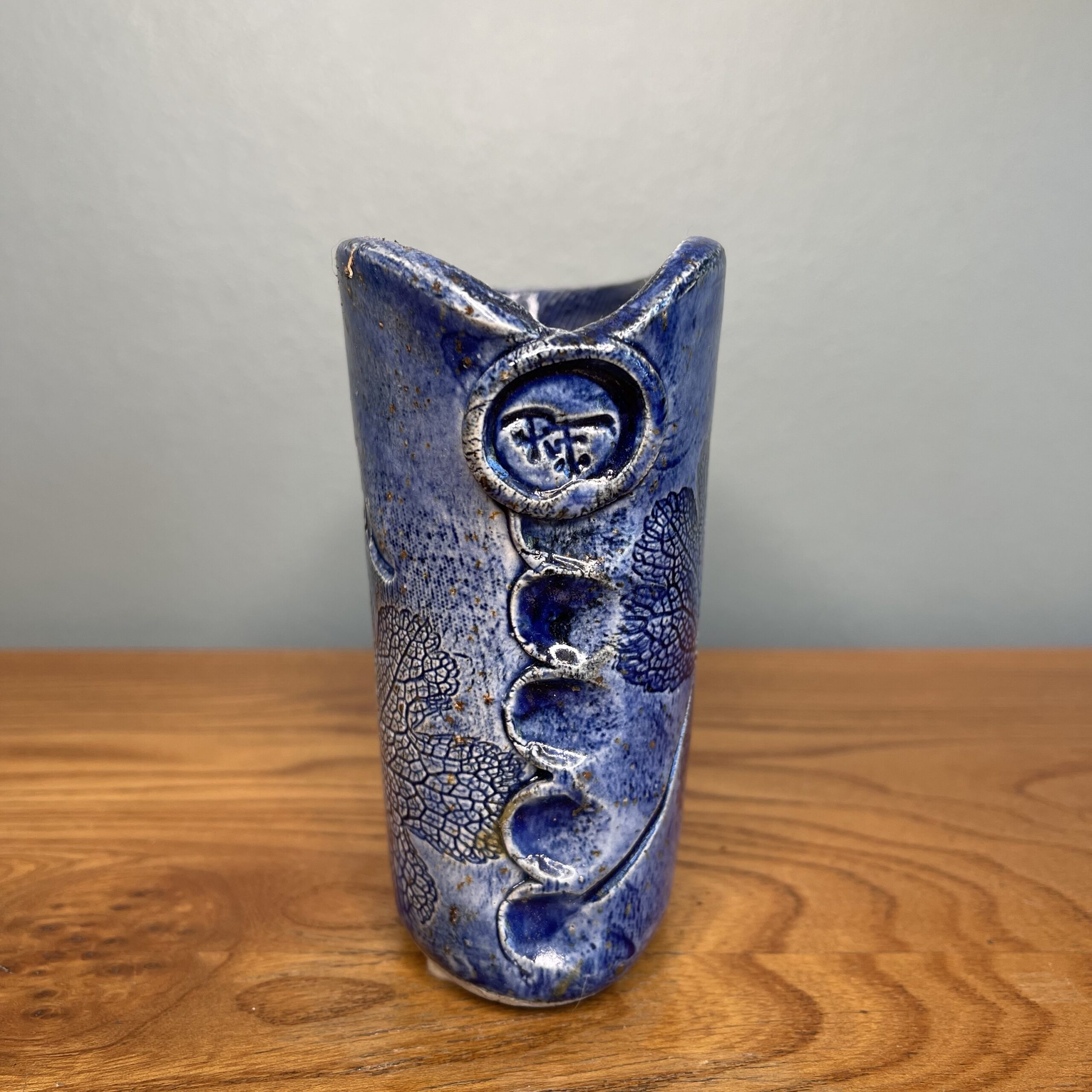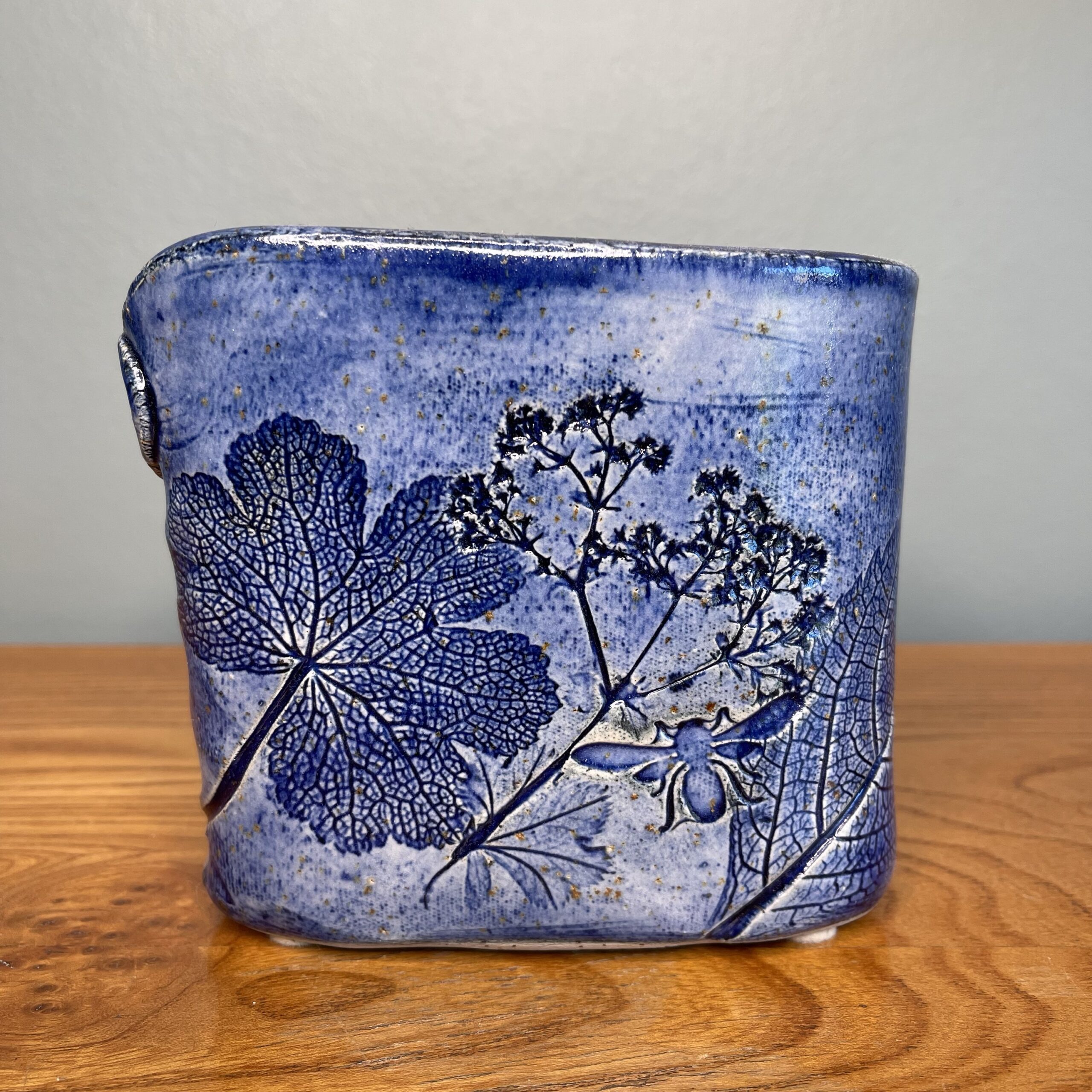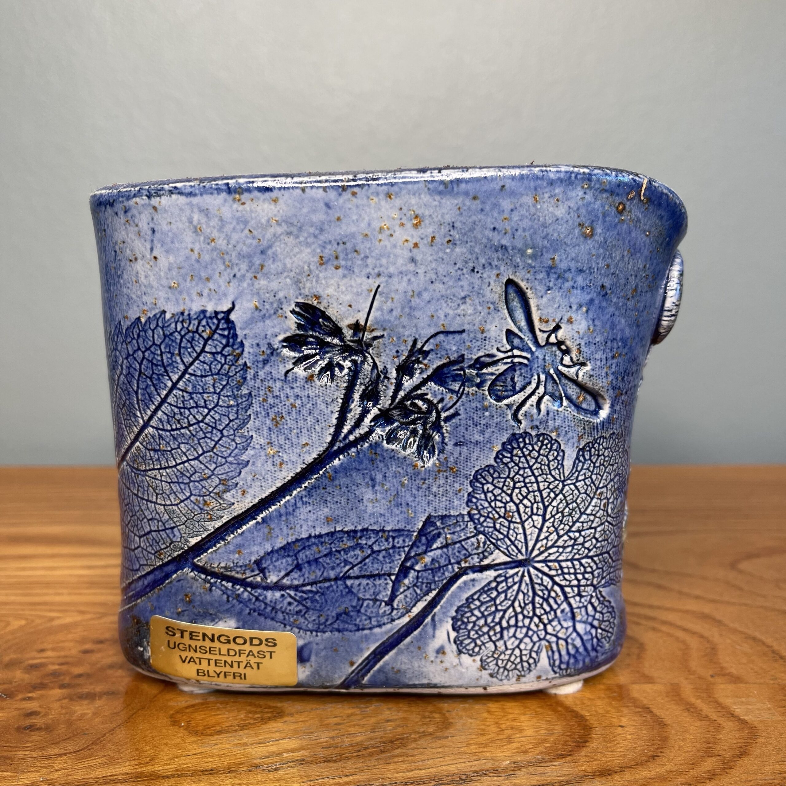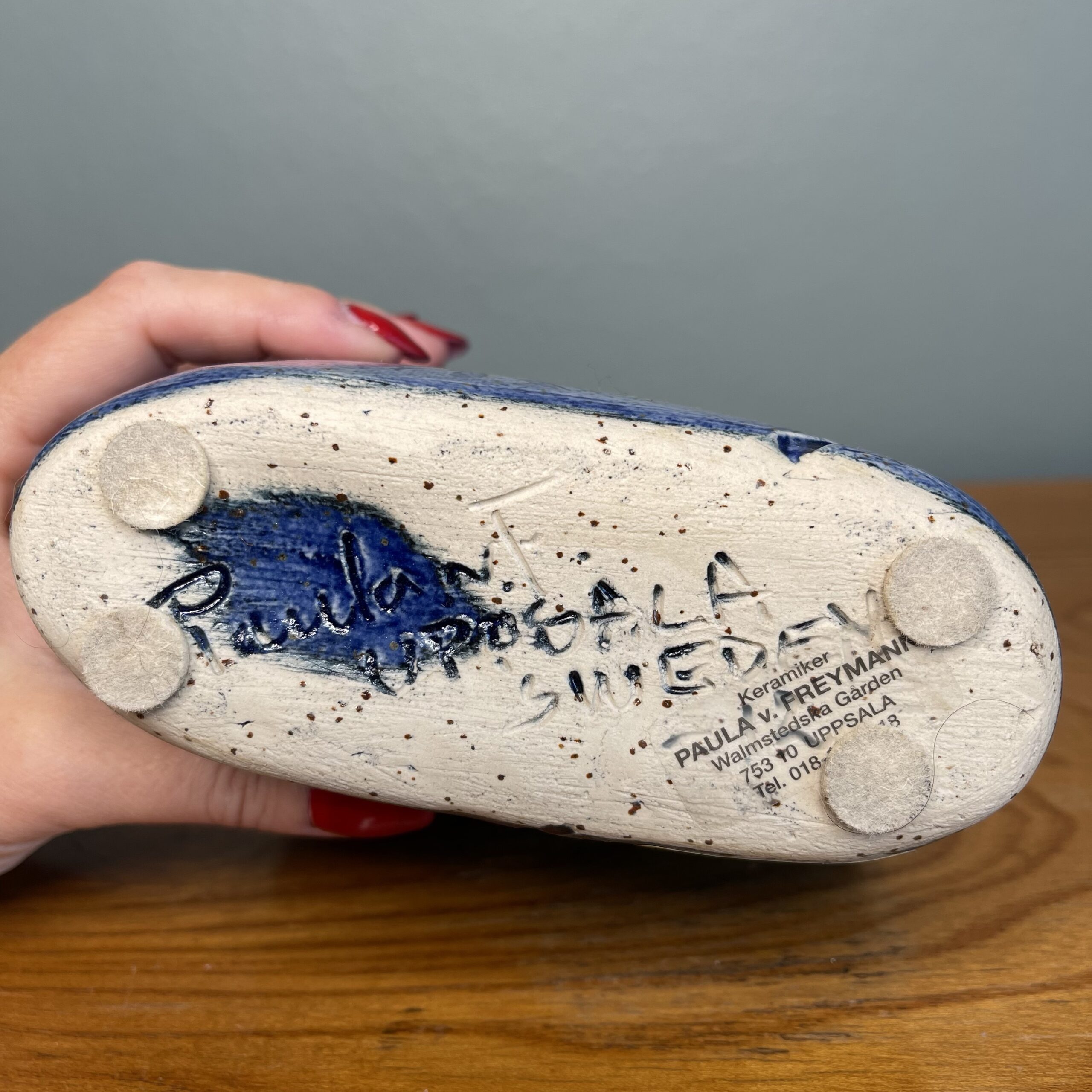 Skønneste svenske keramik vase af Paula V. Freymann. 12cm høj. 13,5cm lang. Blå. Intakt