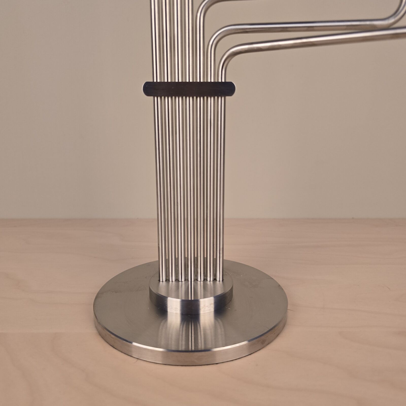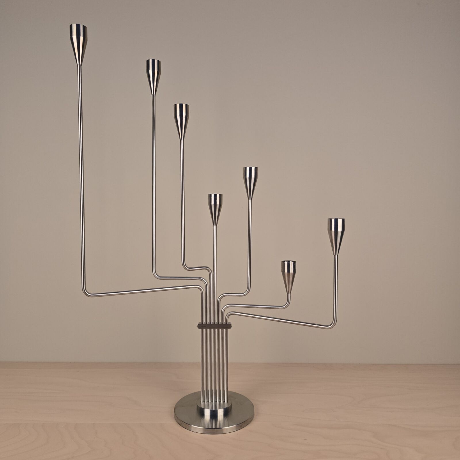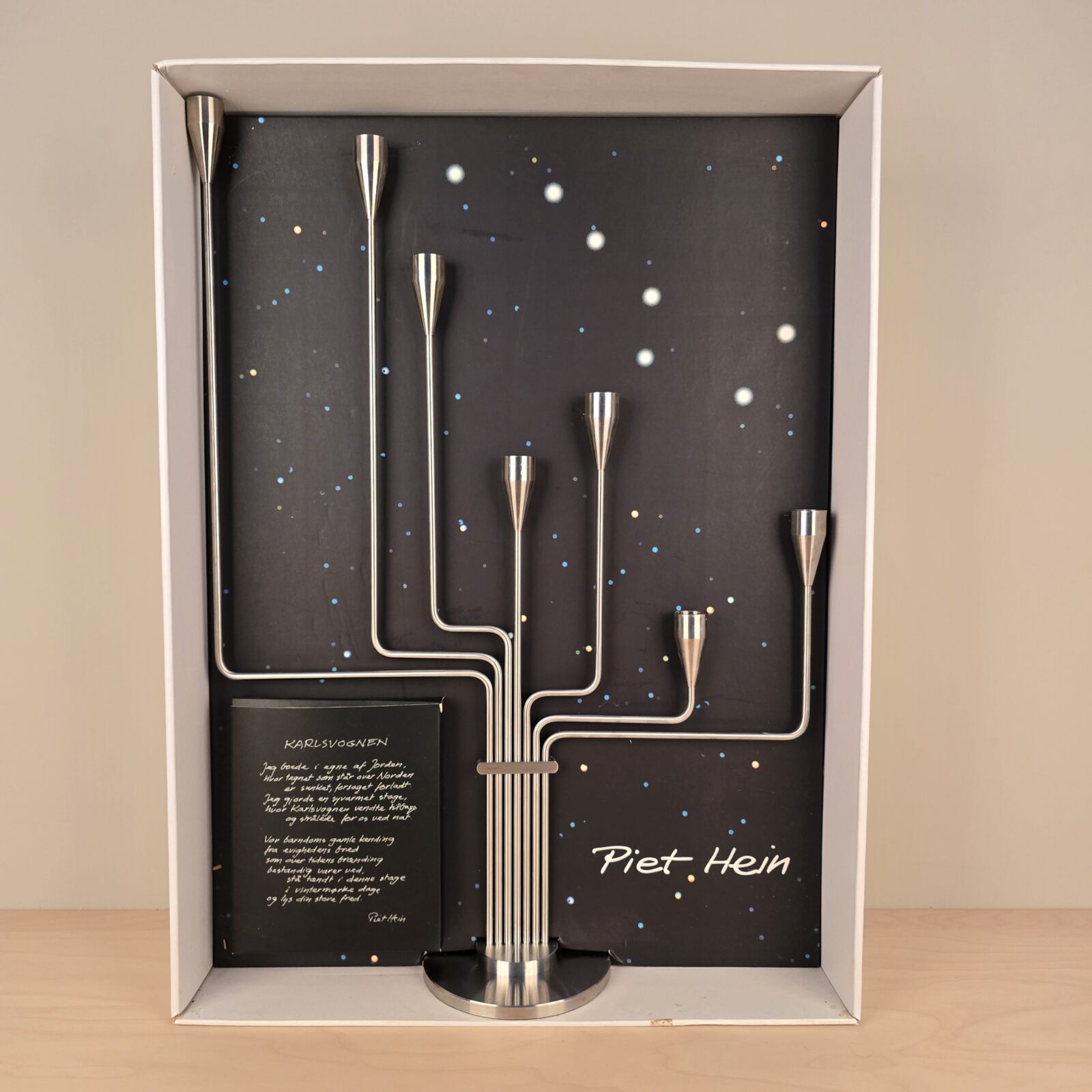 Smuk klassisk 7 armet stage. Karlsvognen af Piet Hein. Børstet stål. Velholdt. 63cm høj. 43cm bred. I original emballage inkl. lys. Designet i 1944. Velholdt.