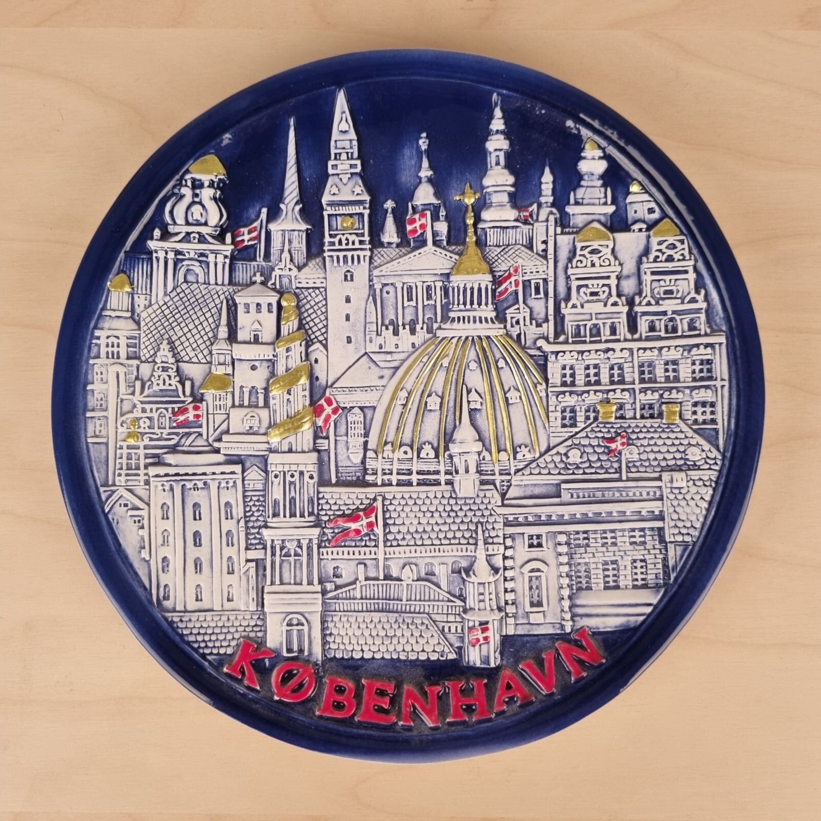 Fin souvenir-platte med præget motiv af københavnske vartegn og seværdigheder.