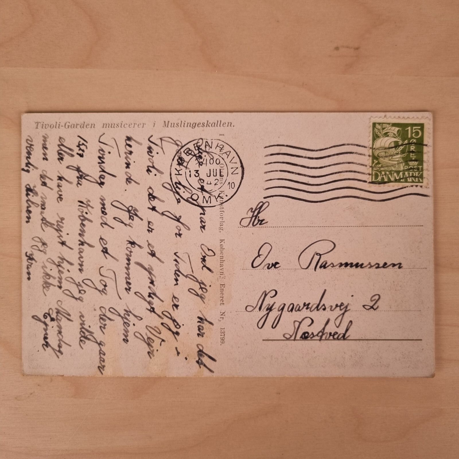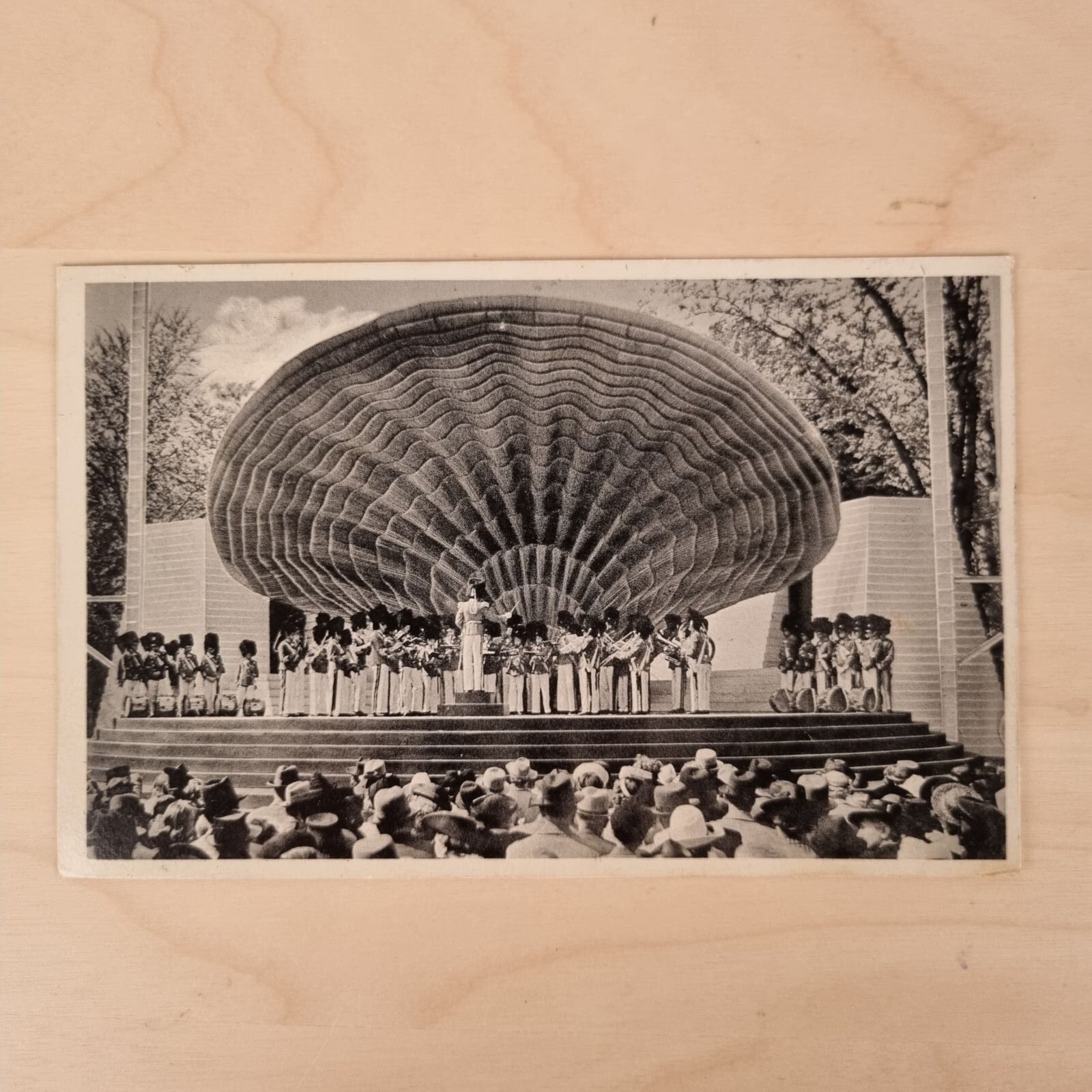 Postkort fra 1942 – Tivoligarden foran Muslingeskallen i Tivoli