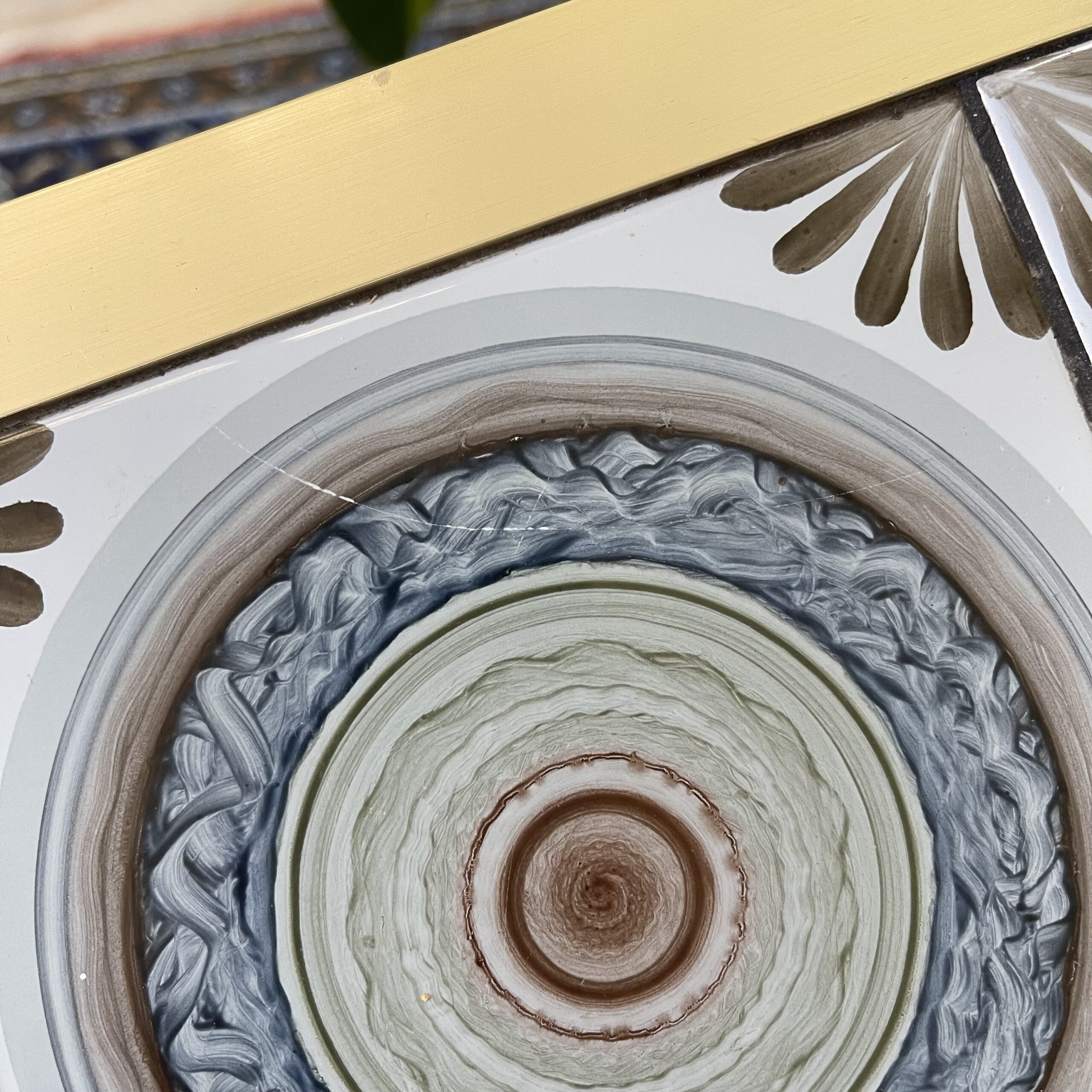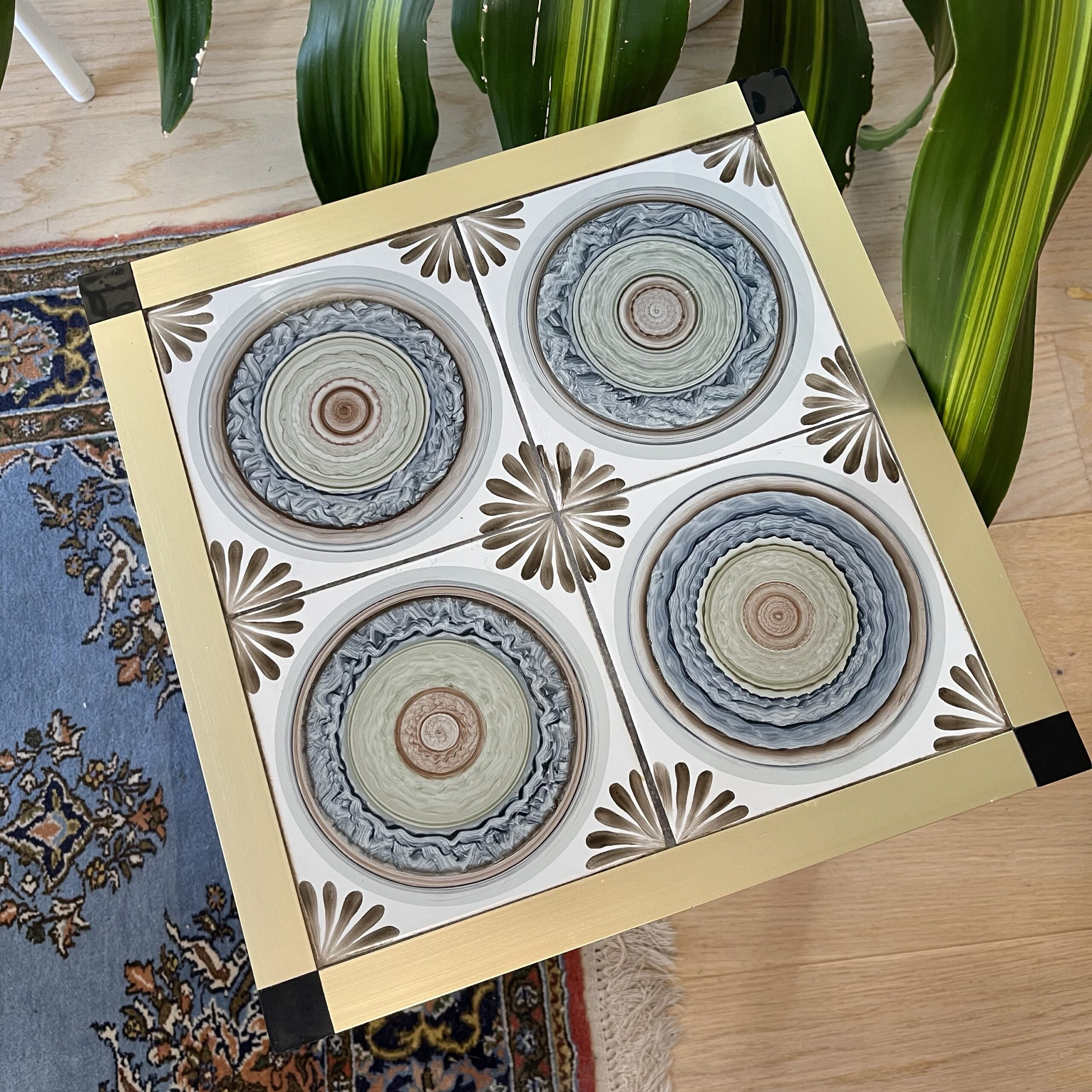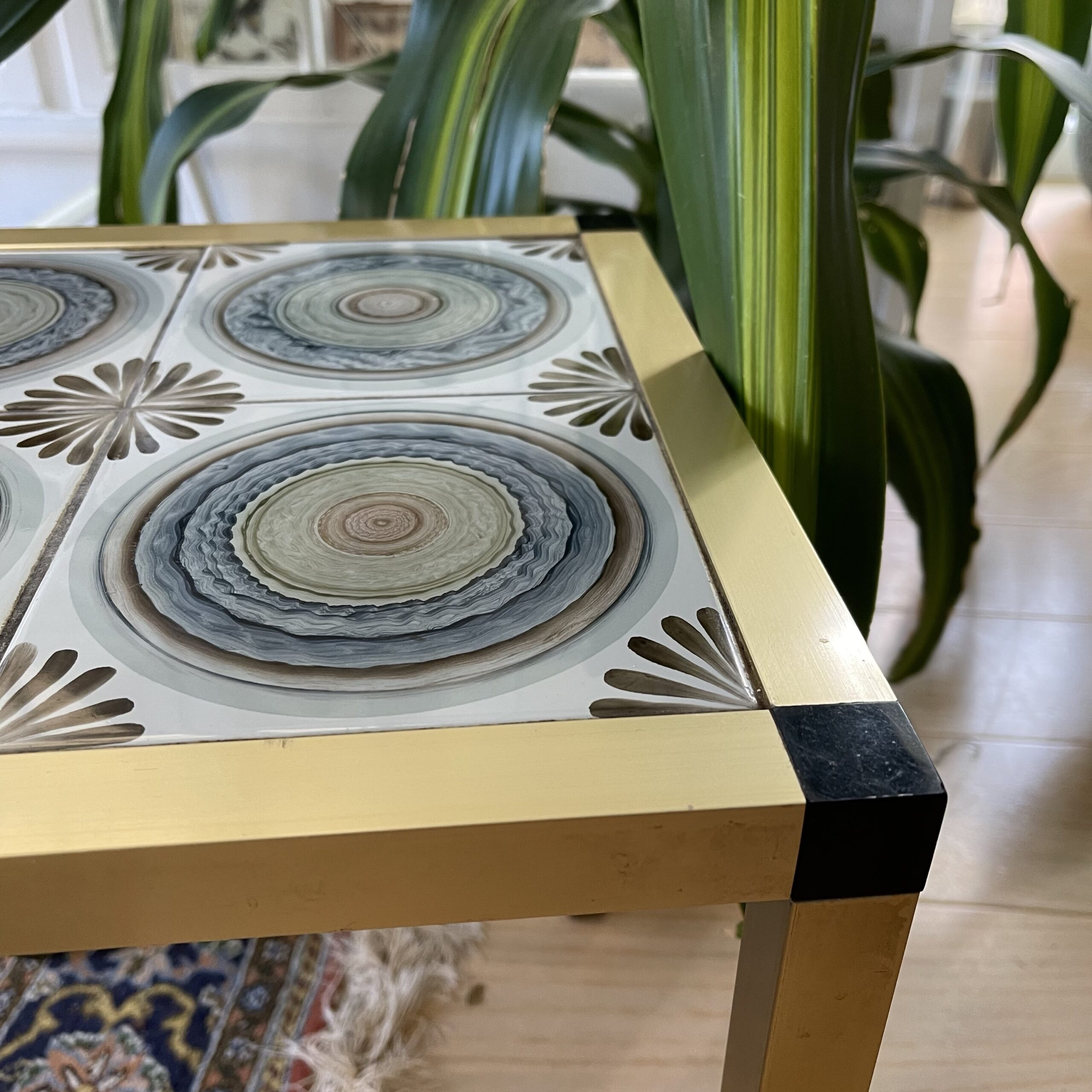 Fedt retro sidebord med de smukkeste kakler. 1 har desværre revne (se billede), som stort set ikke synes. Metalben i messingfarve. 35,5×35,5cm. 43cm højt.