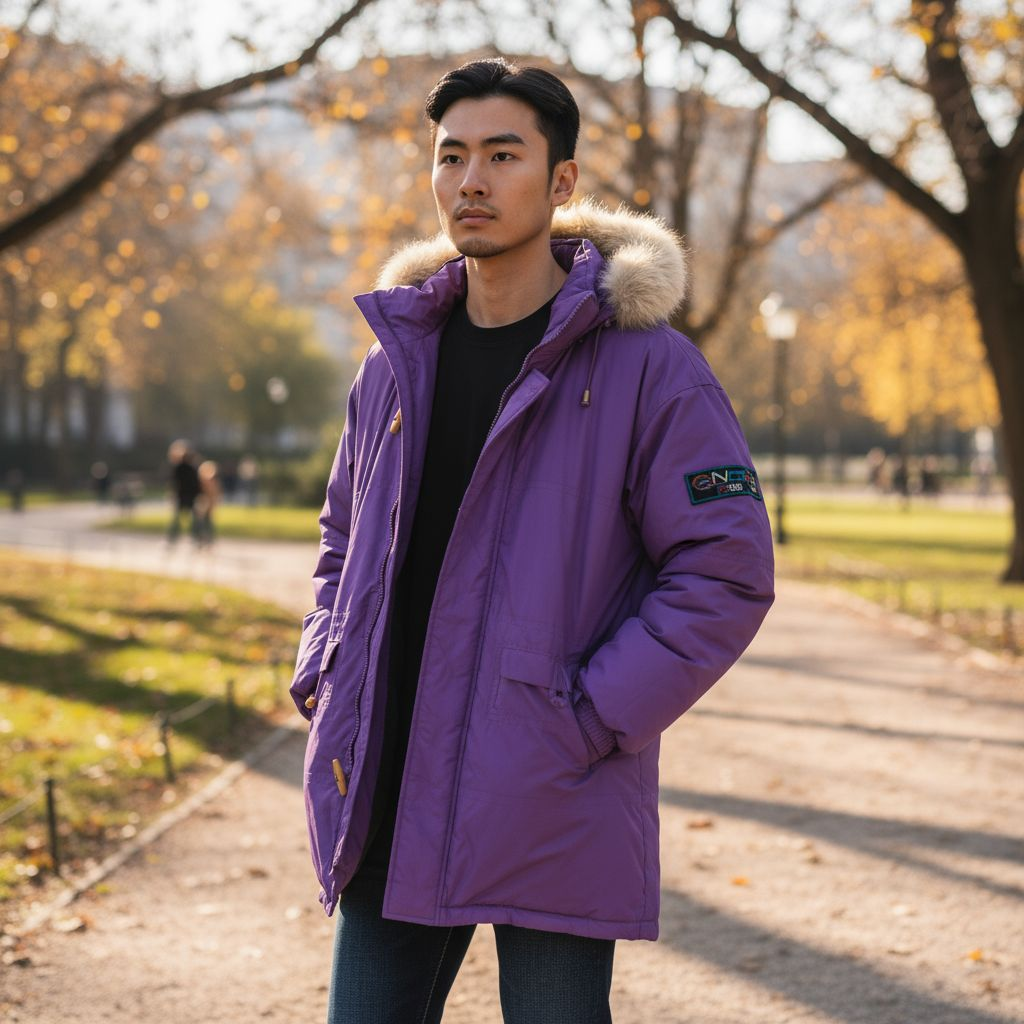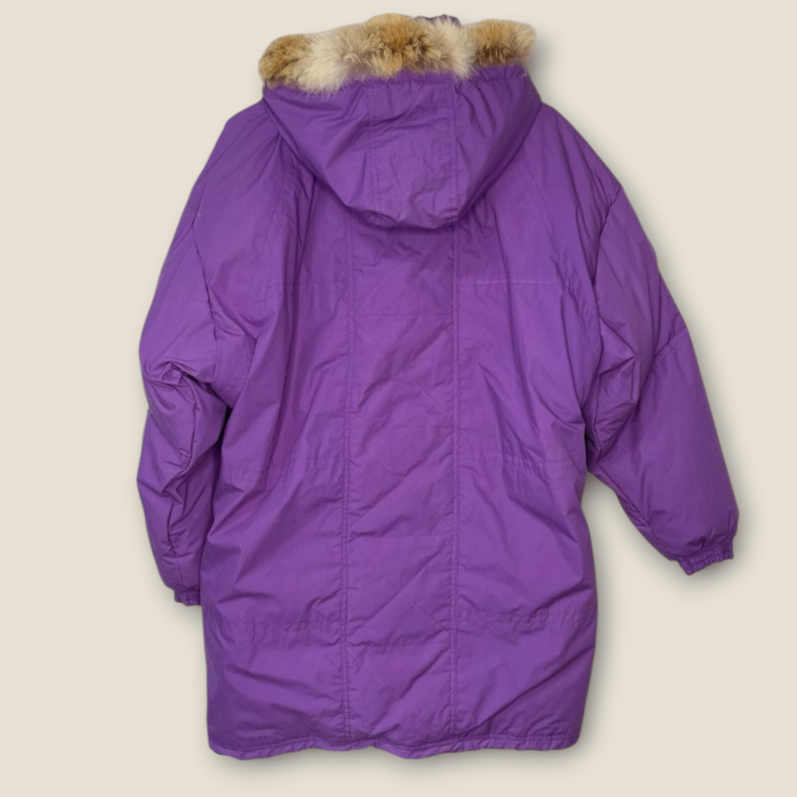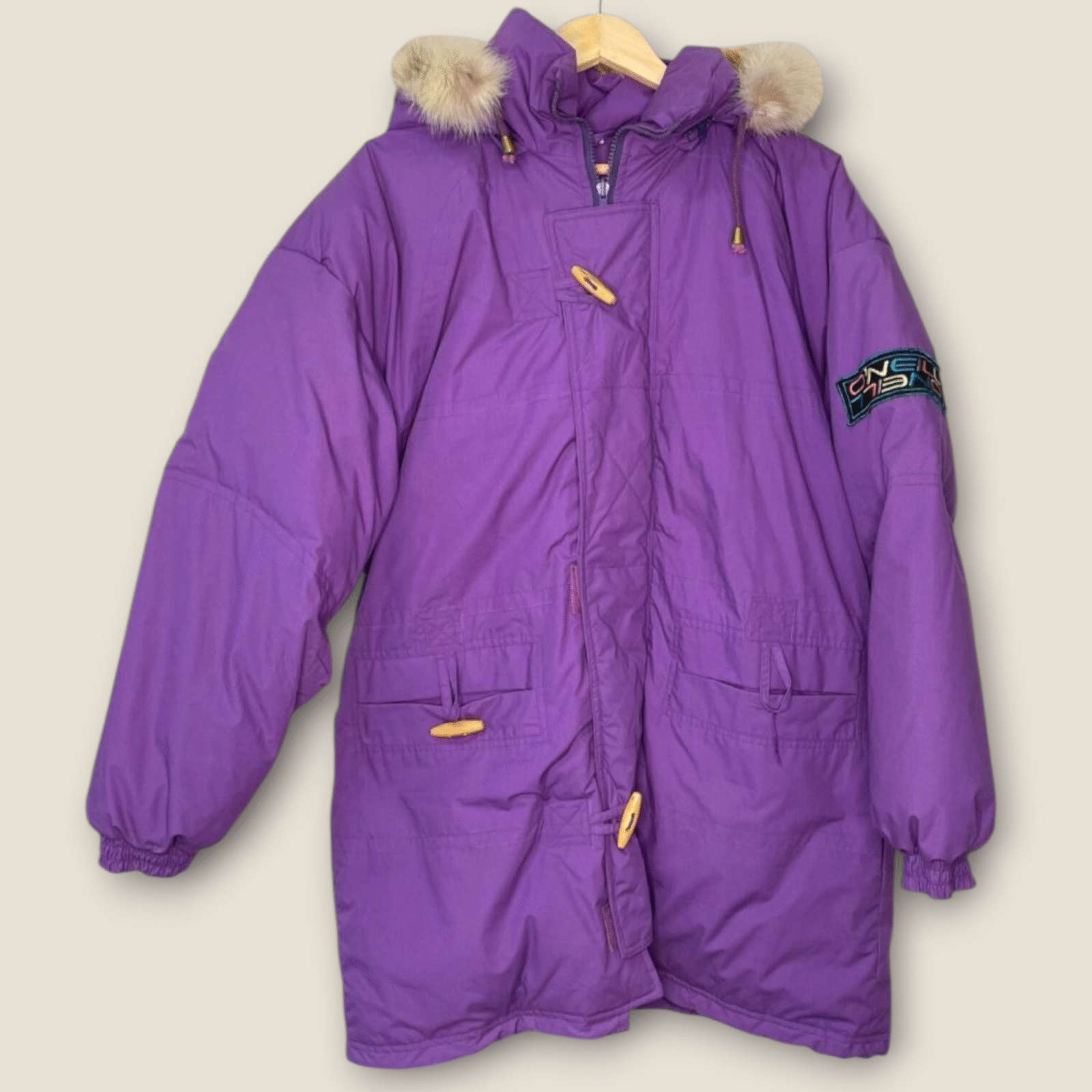 Retro O’Neil vinterfrakke med pelskant. Lilla. Mangler 1 knap (se billede). Str.L. Velholdt genbrug.