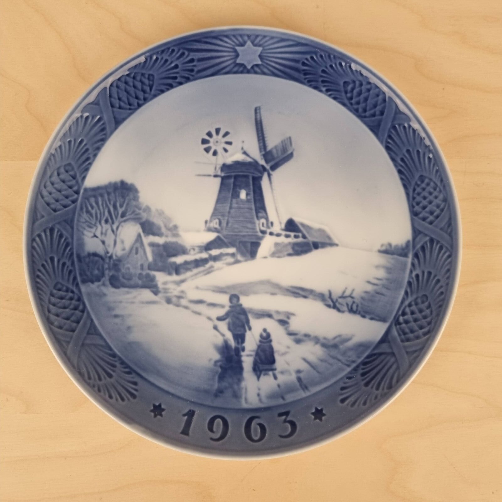 Royal Copenhagen juleplatte fra 1963 med motiv “Snelandskab med vindmølle” af Kaj Lange.