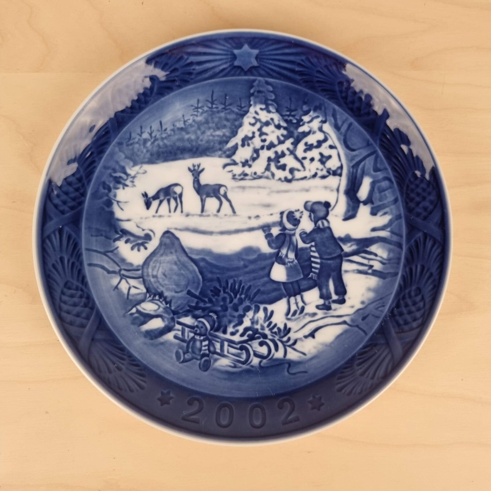 Royal Copenhagen juleplatte fra 2002 med motiv “Vinter i skoven” af Sven Vestergaard.