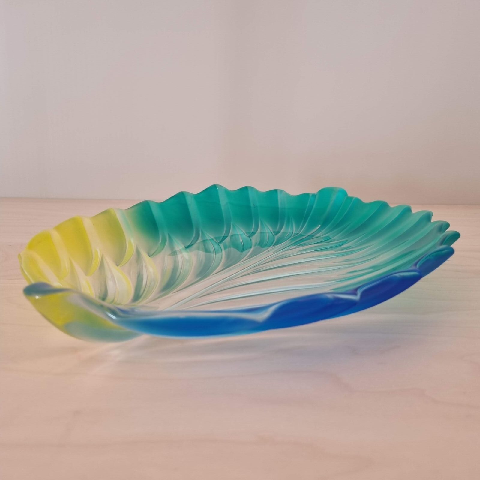 Fantastisk fad i glas. Bladformet, og dekoreret med gule, blå og grønne farver.
