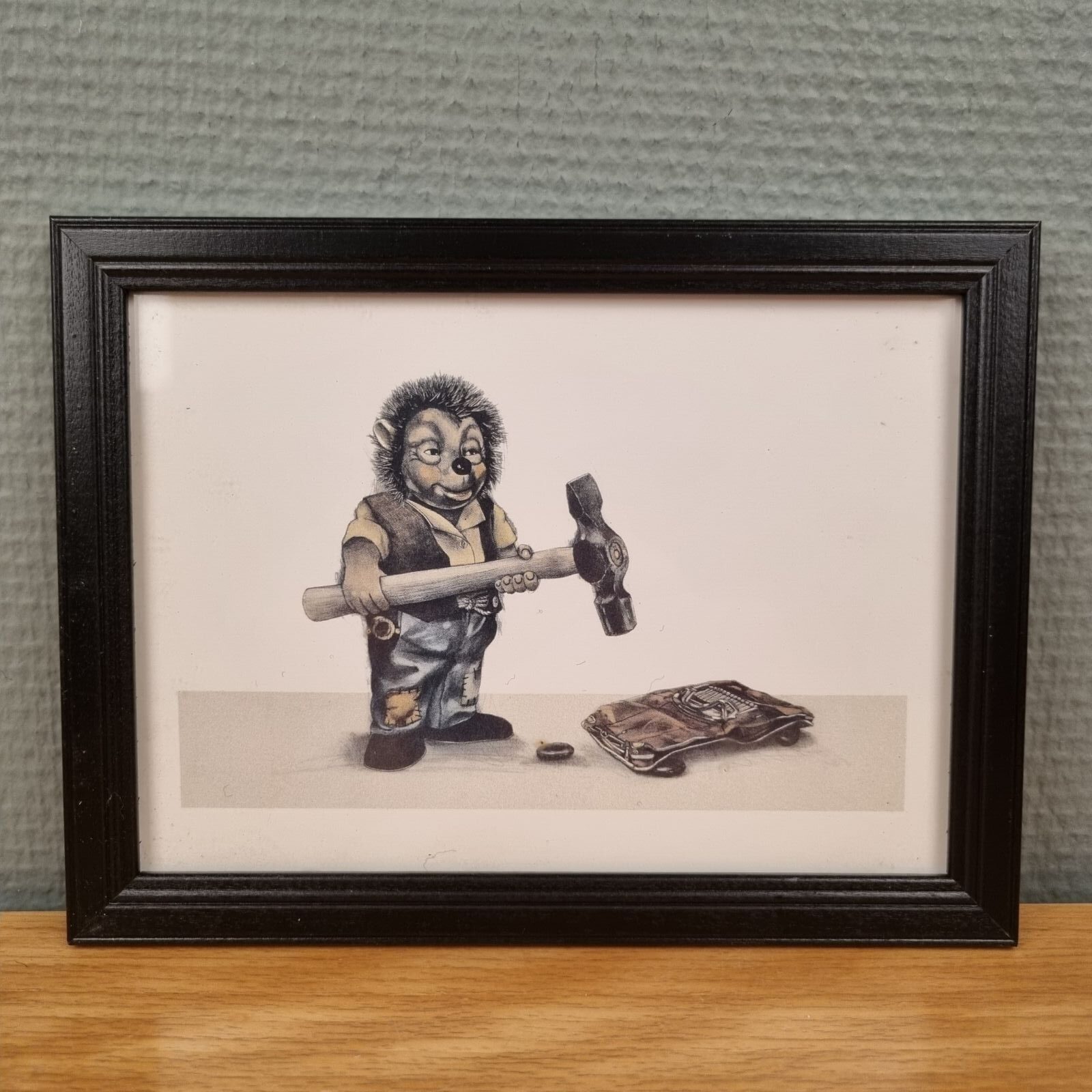 Tryk i ramme af Lasse Åberg – Pindsvin med hammer