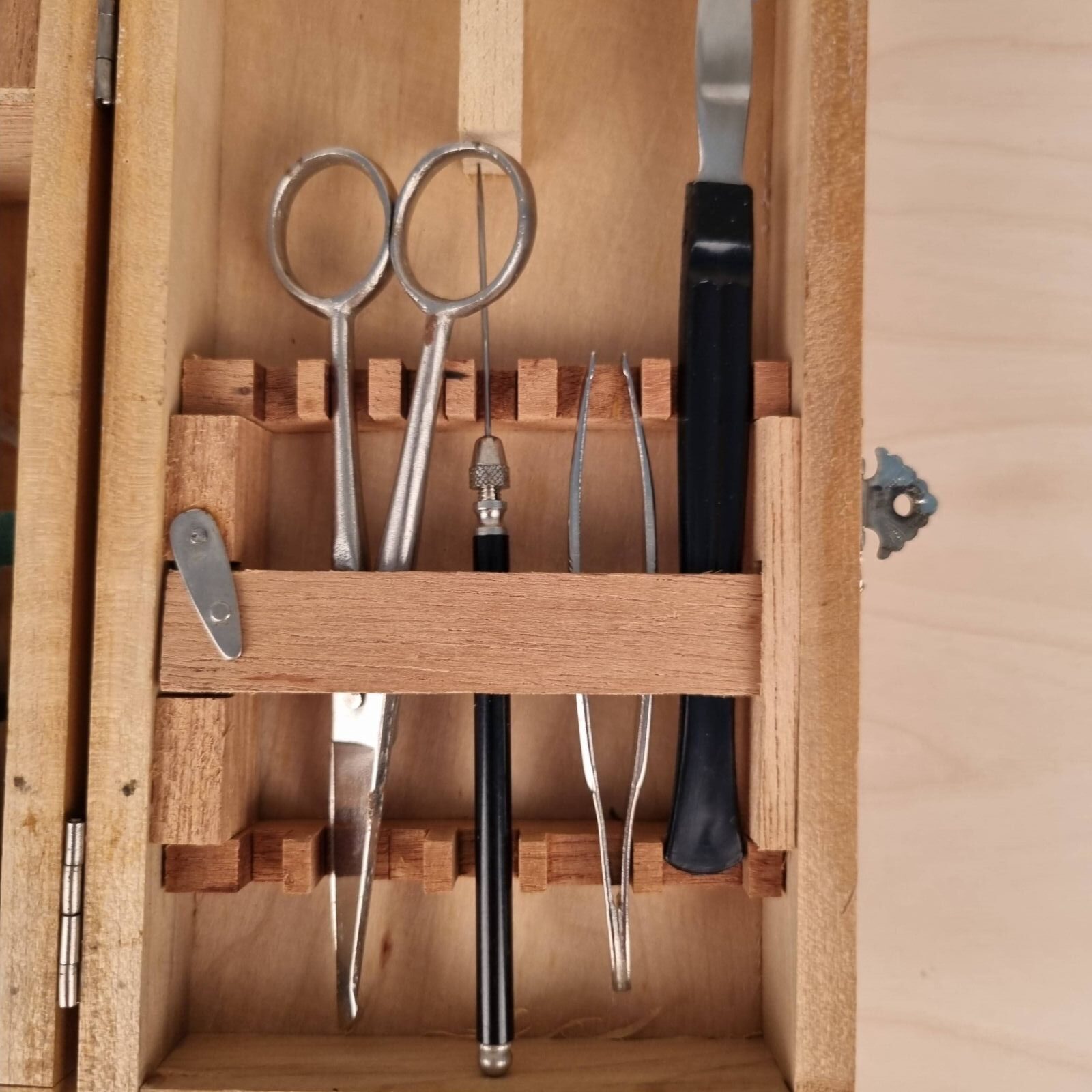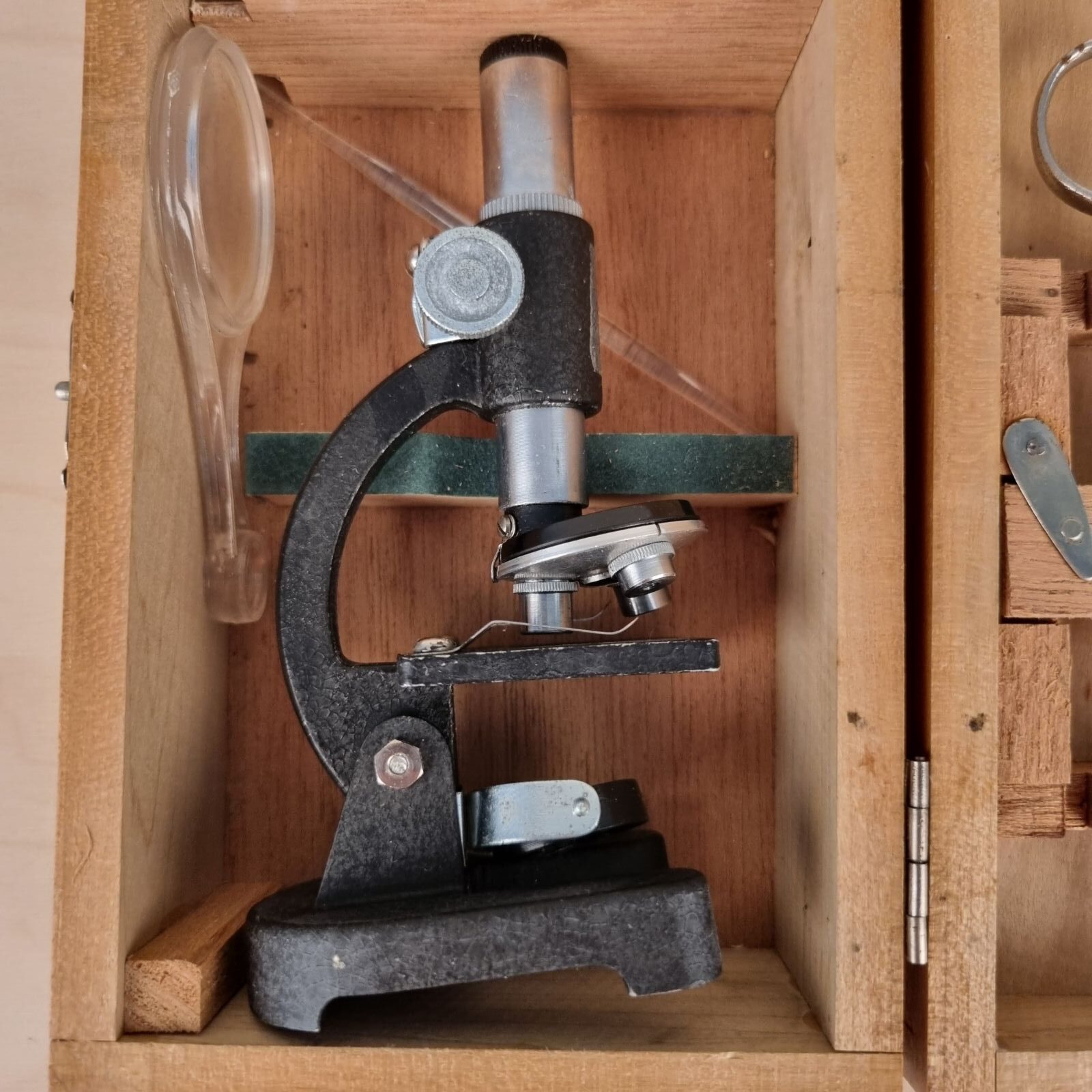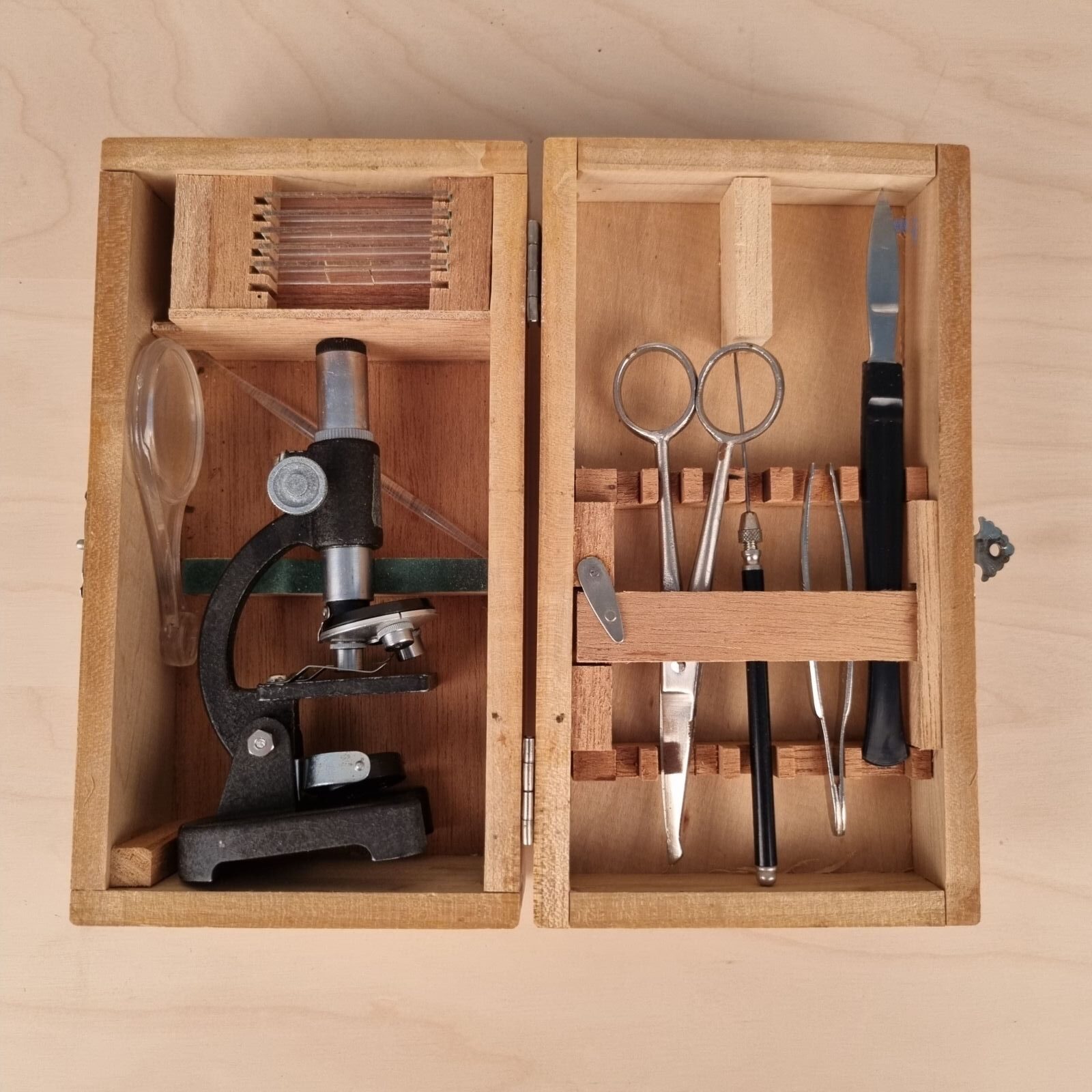 Lille mikroskopisæt fra 1950’erne i fin trææske.