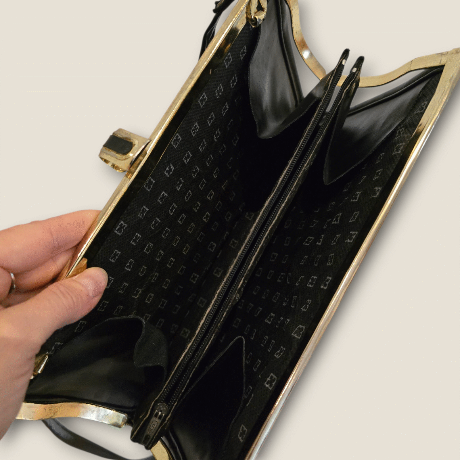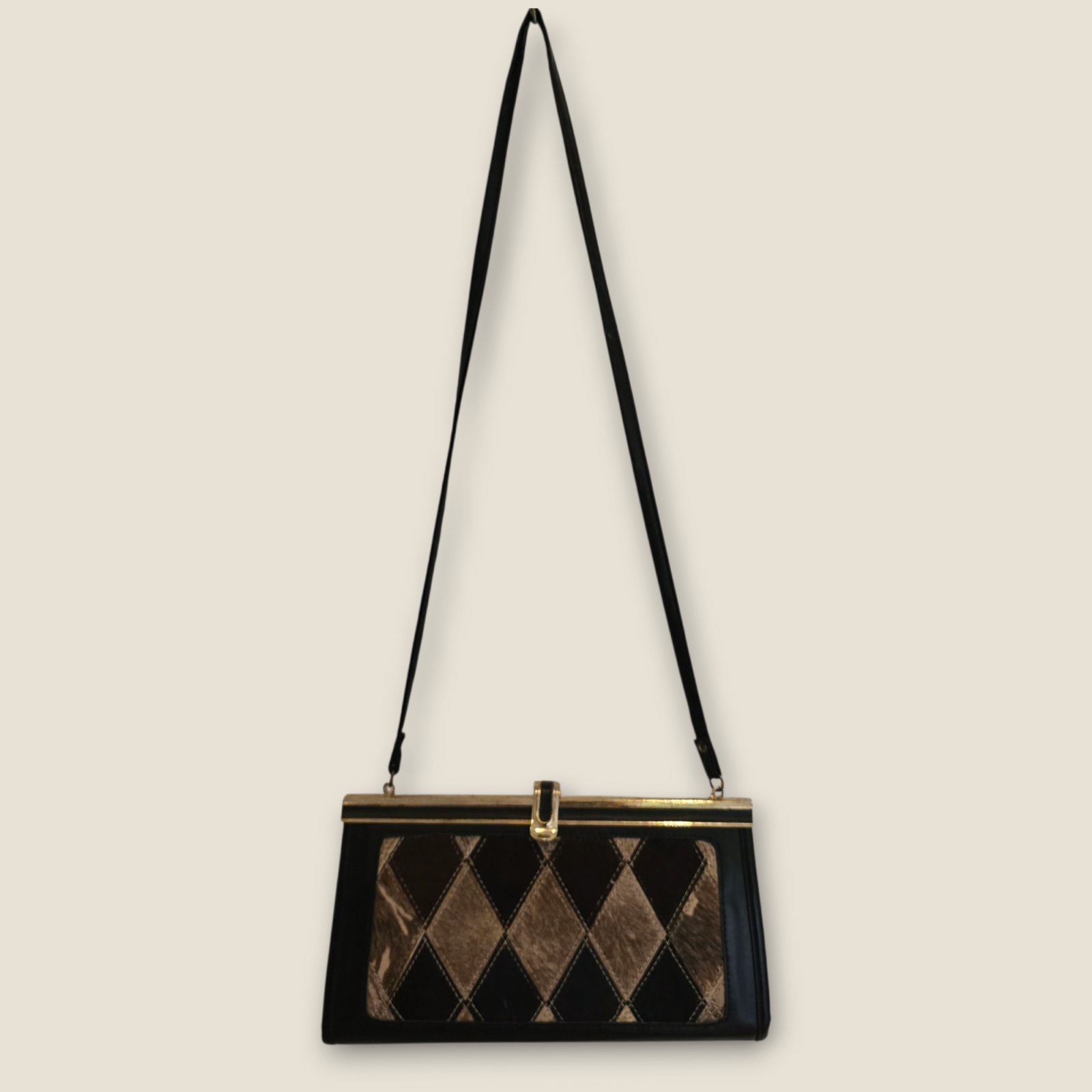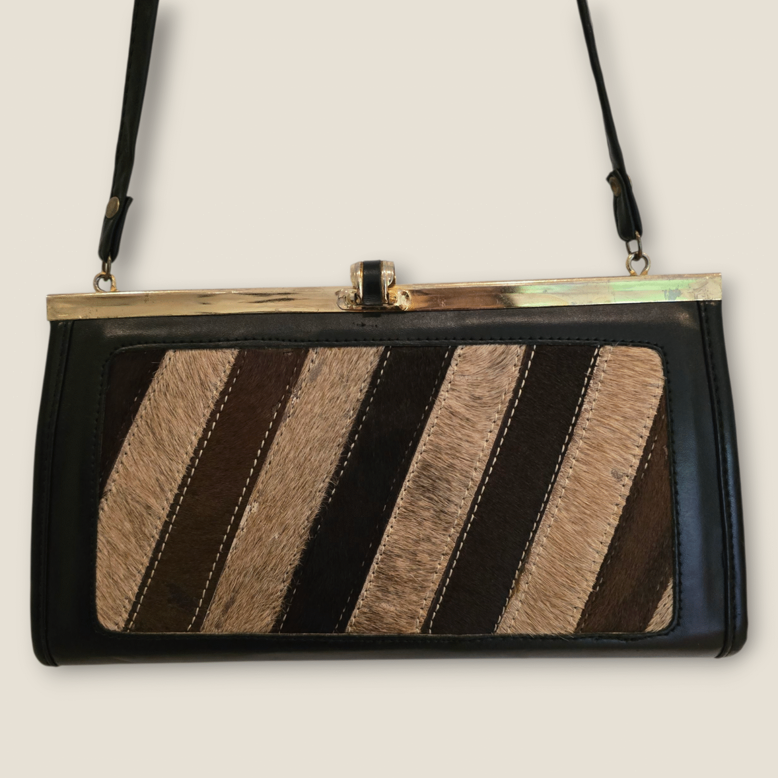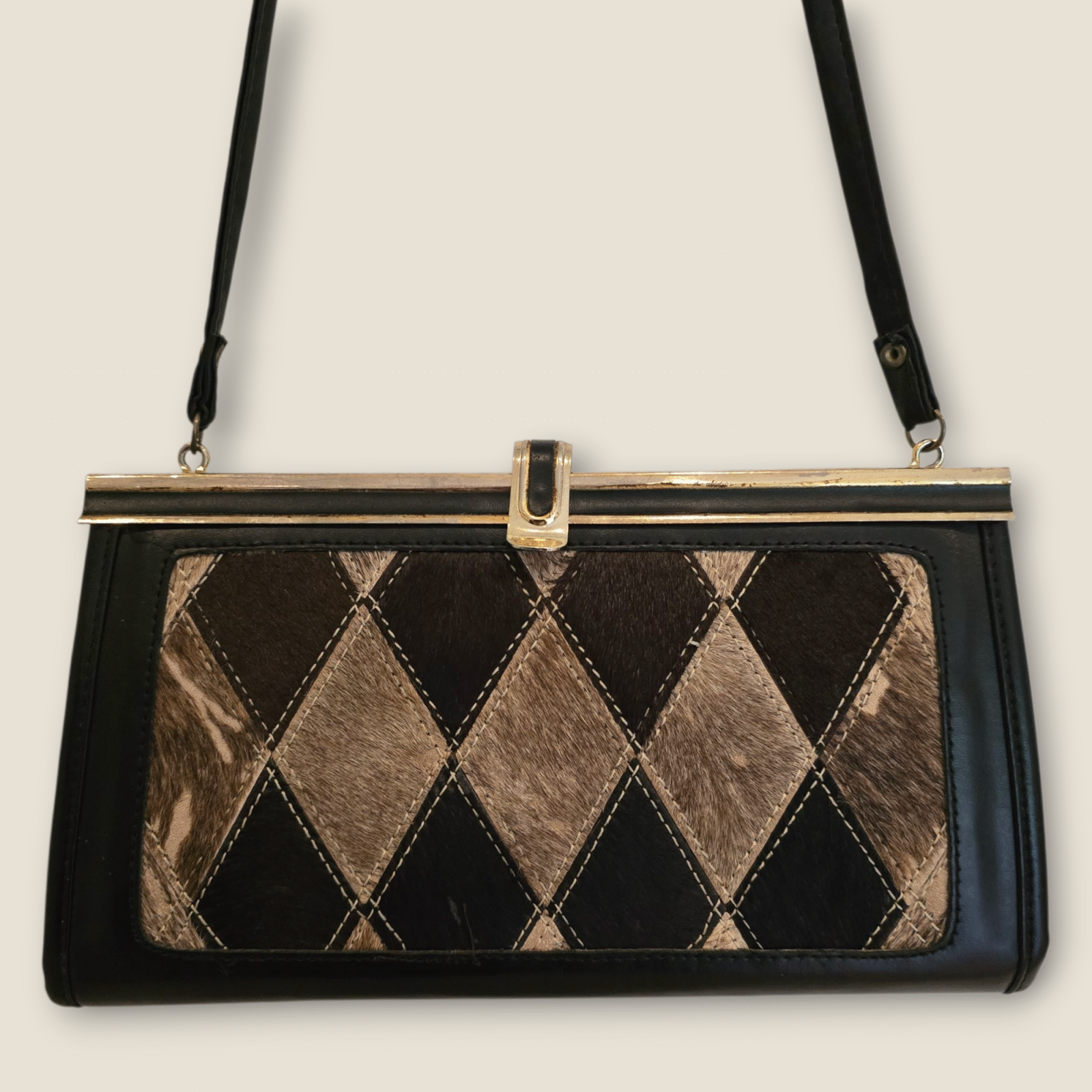 Vintage skuldertaske. Sort læder med brun pels. Guldfarvet lukning. Velholdt genbrug.