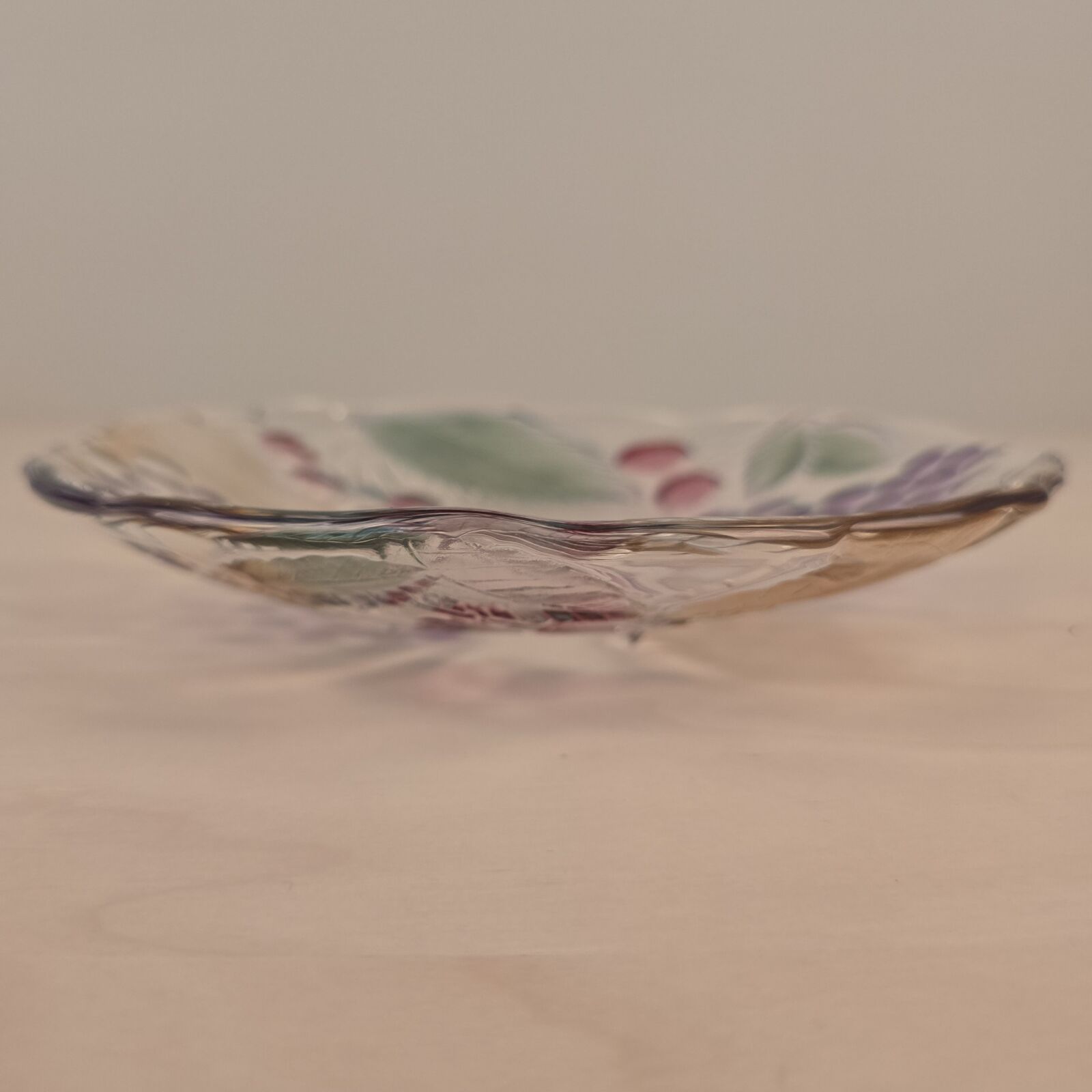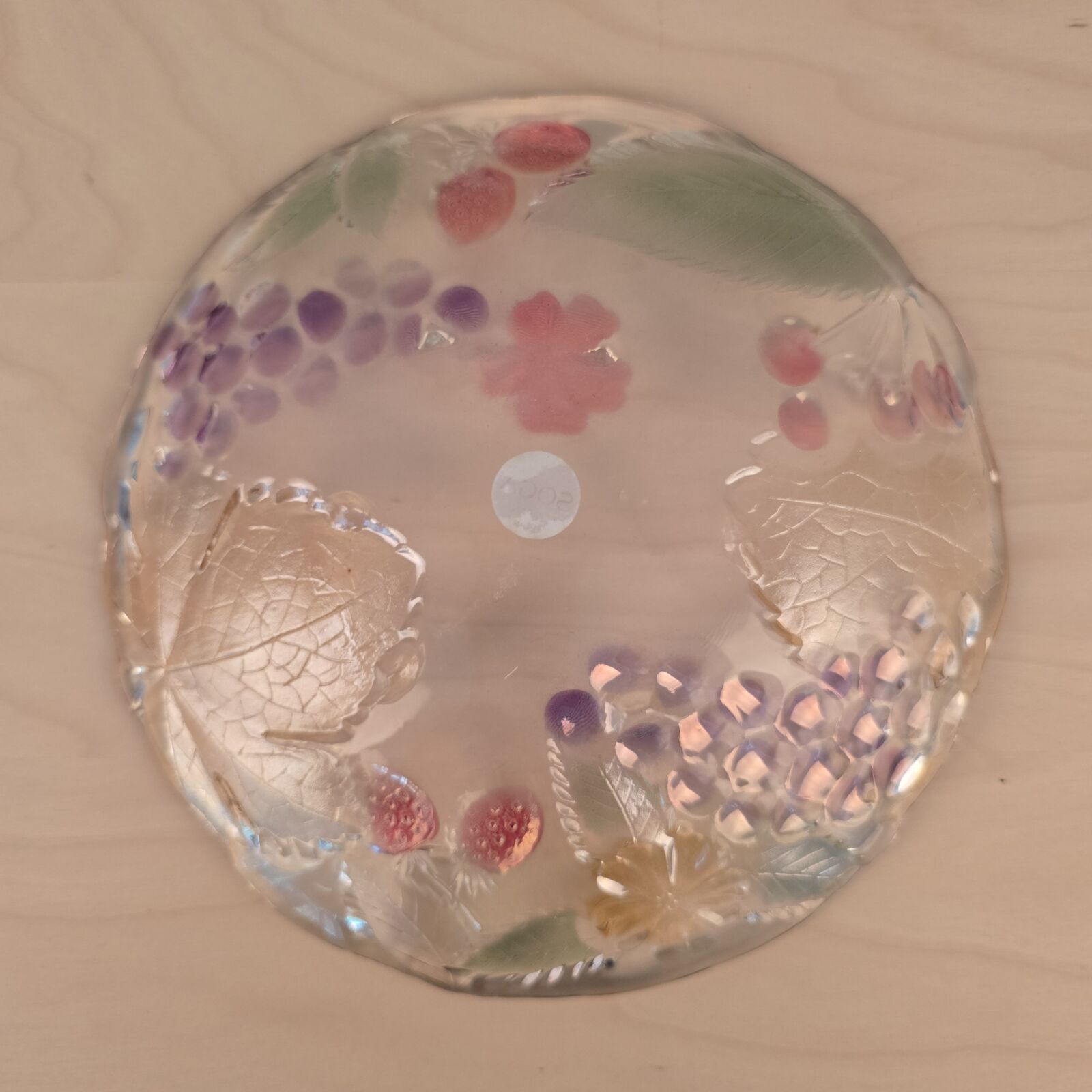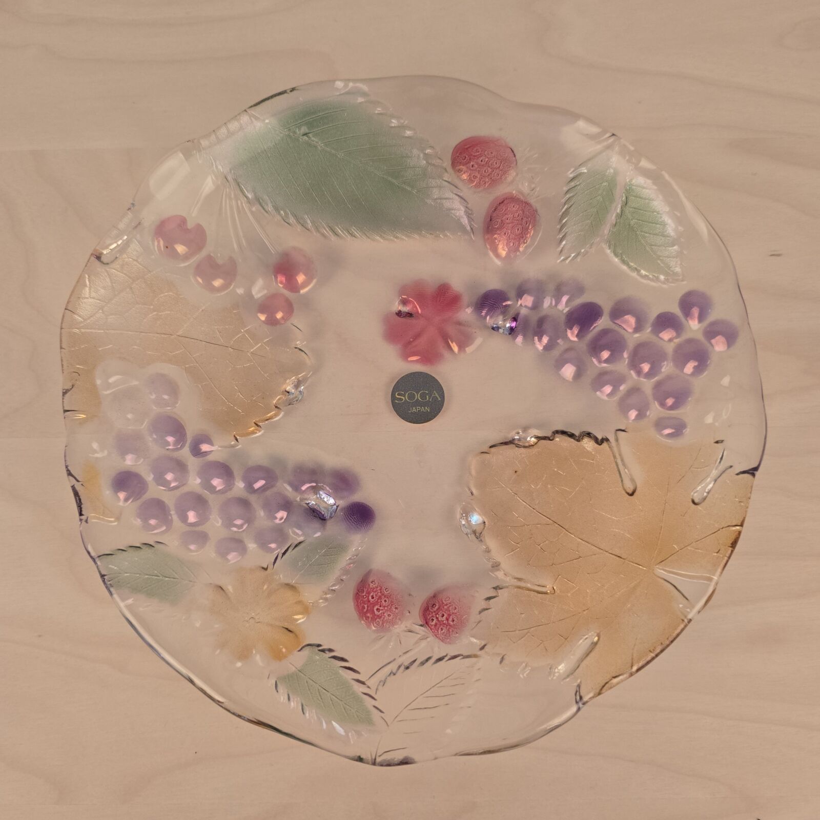 Soga glasfad med vindruer og blade. Japan. Presset og bemalet glas. 21cm Ø. Velholdt og intakt.