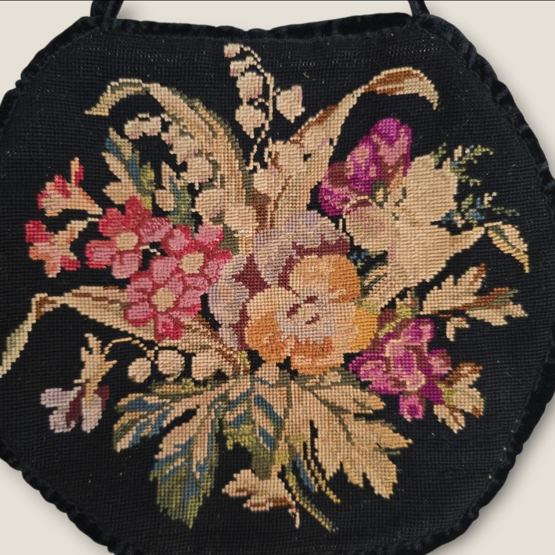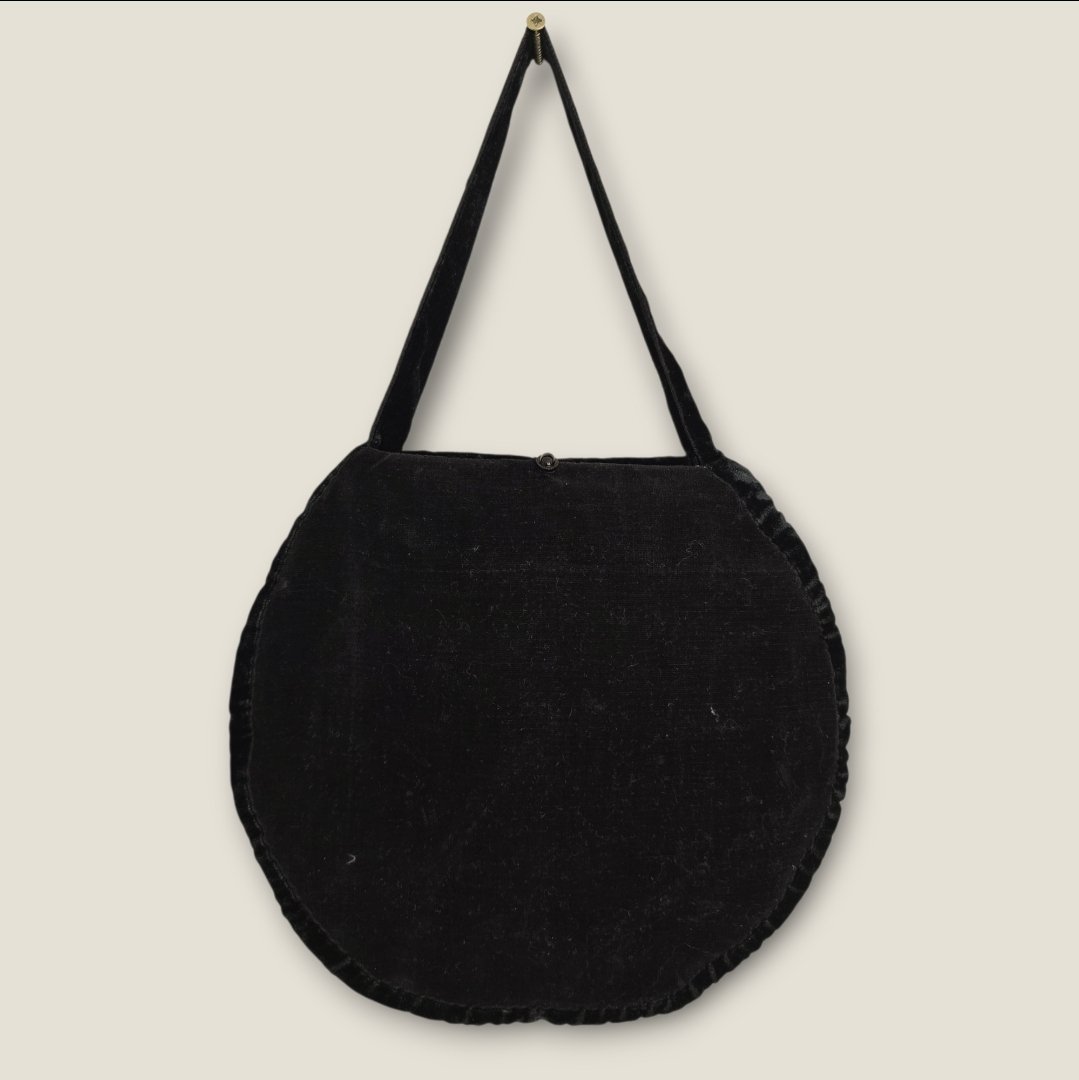 Vintage taske med broderi. Sort. Velholdt genbrug. 25cm Ø. Hank 17cm. Velour.