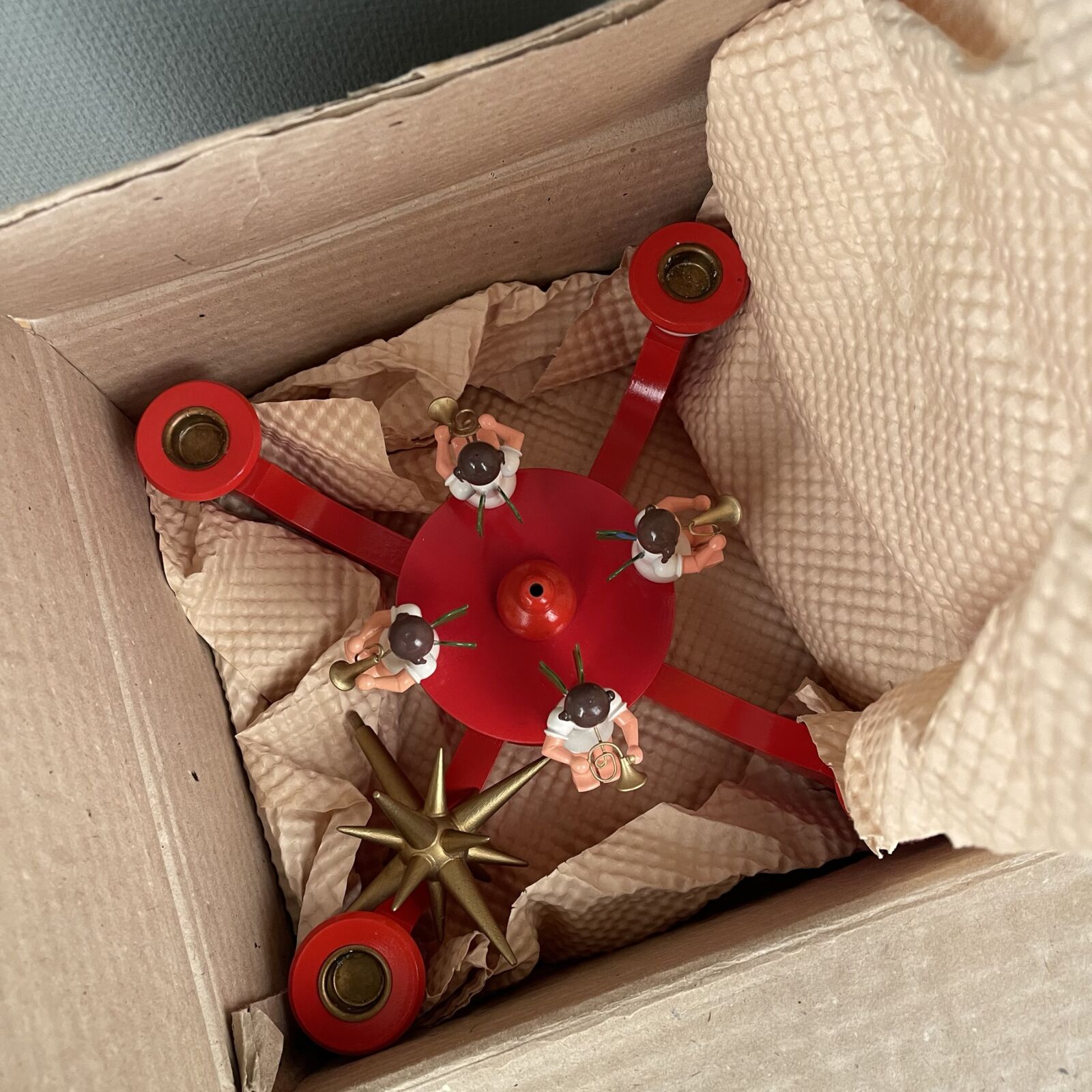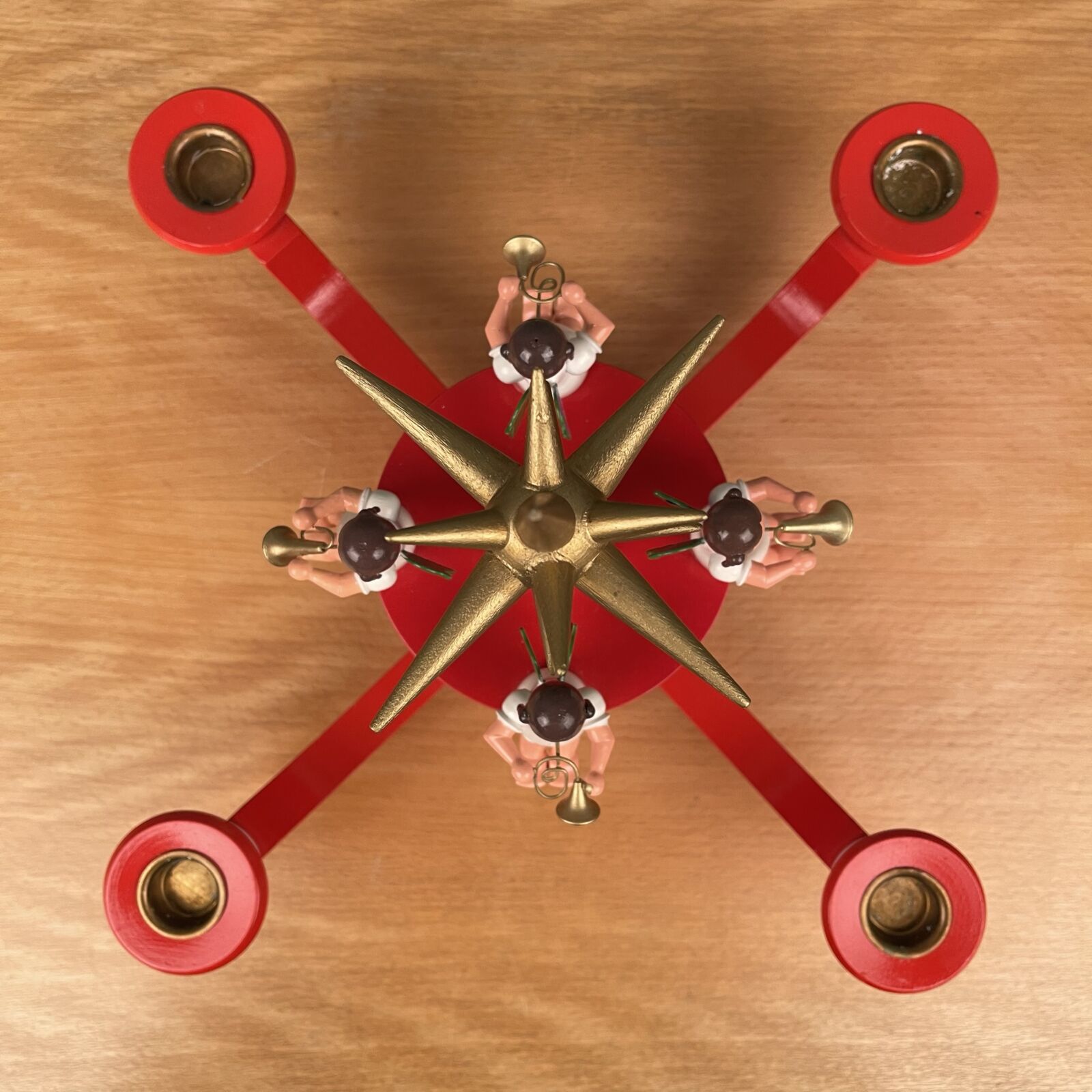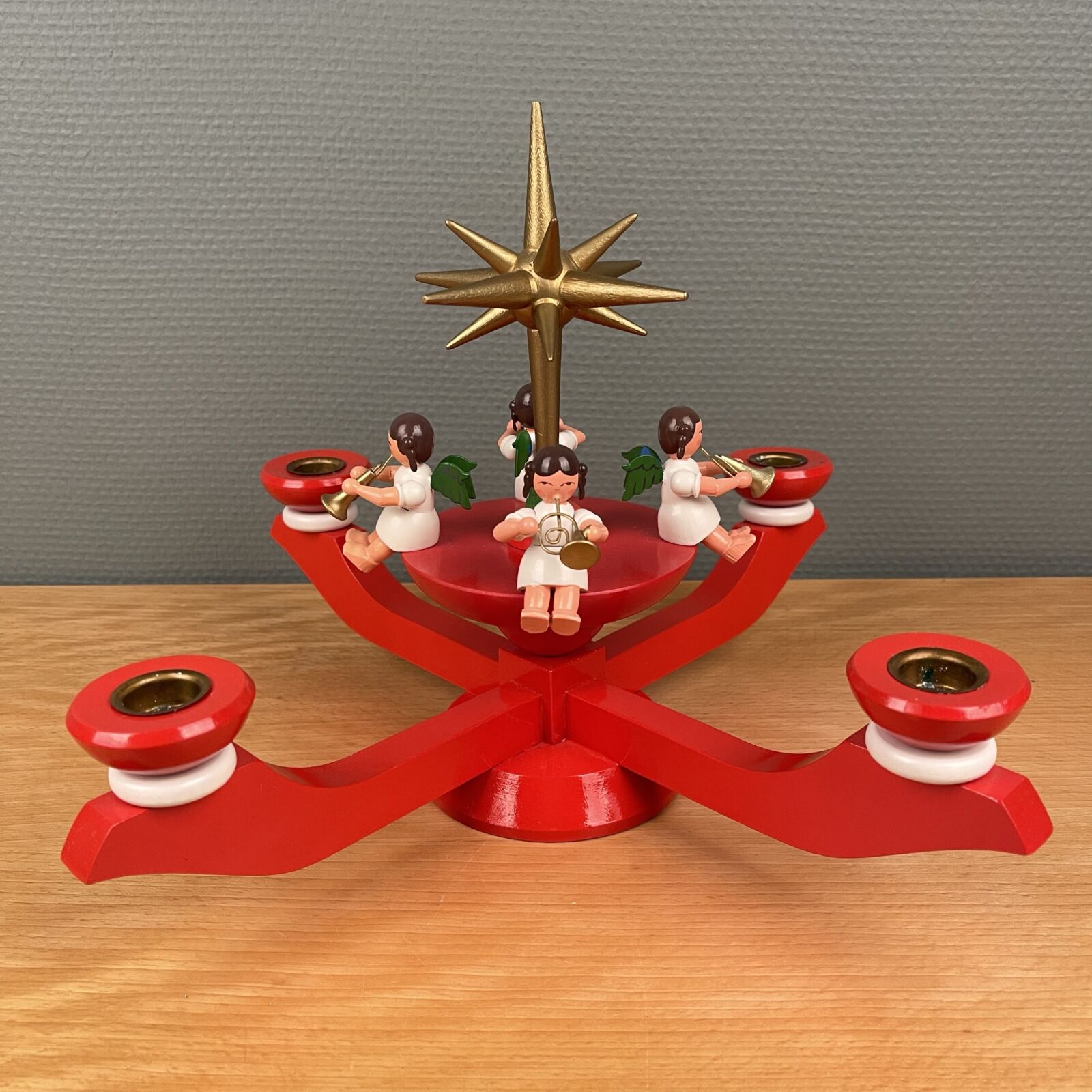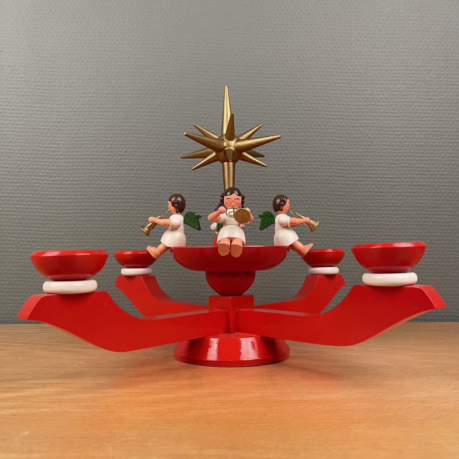 Wendt & Kühn / Erzgebirge advent stage. Med 4 engle og stor topstjerne. Fremstår som ny og i original æske. Måler 37cm Ø. 25cm høj.