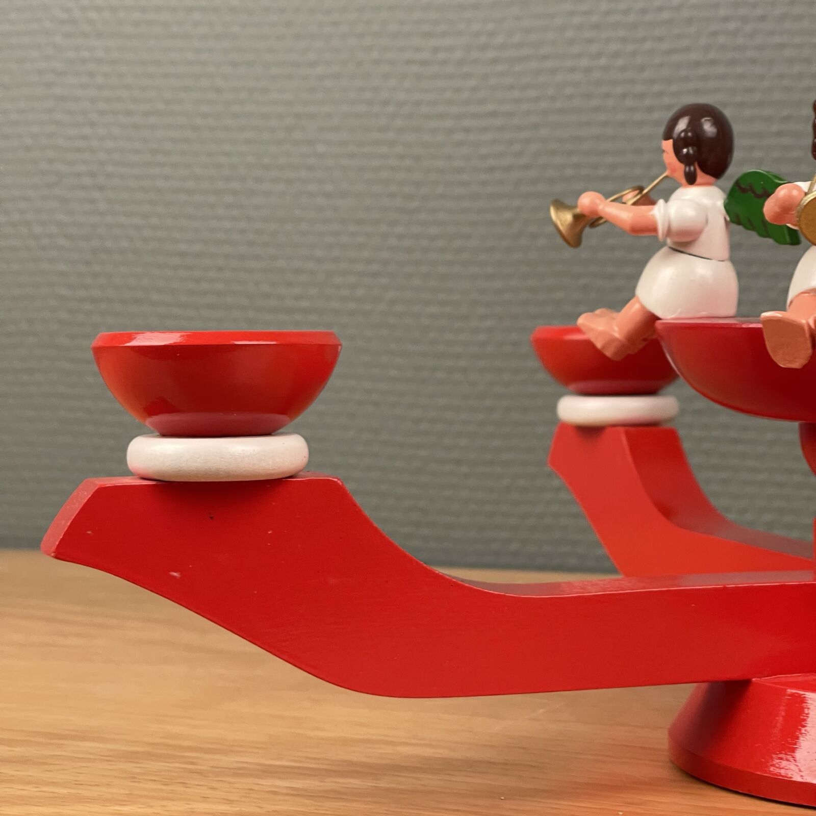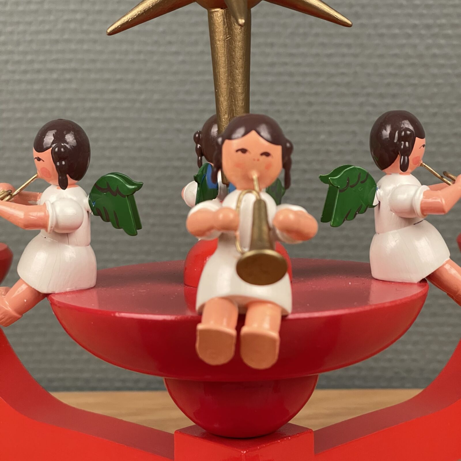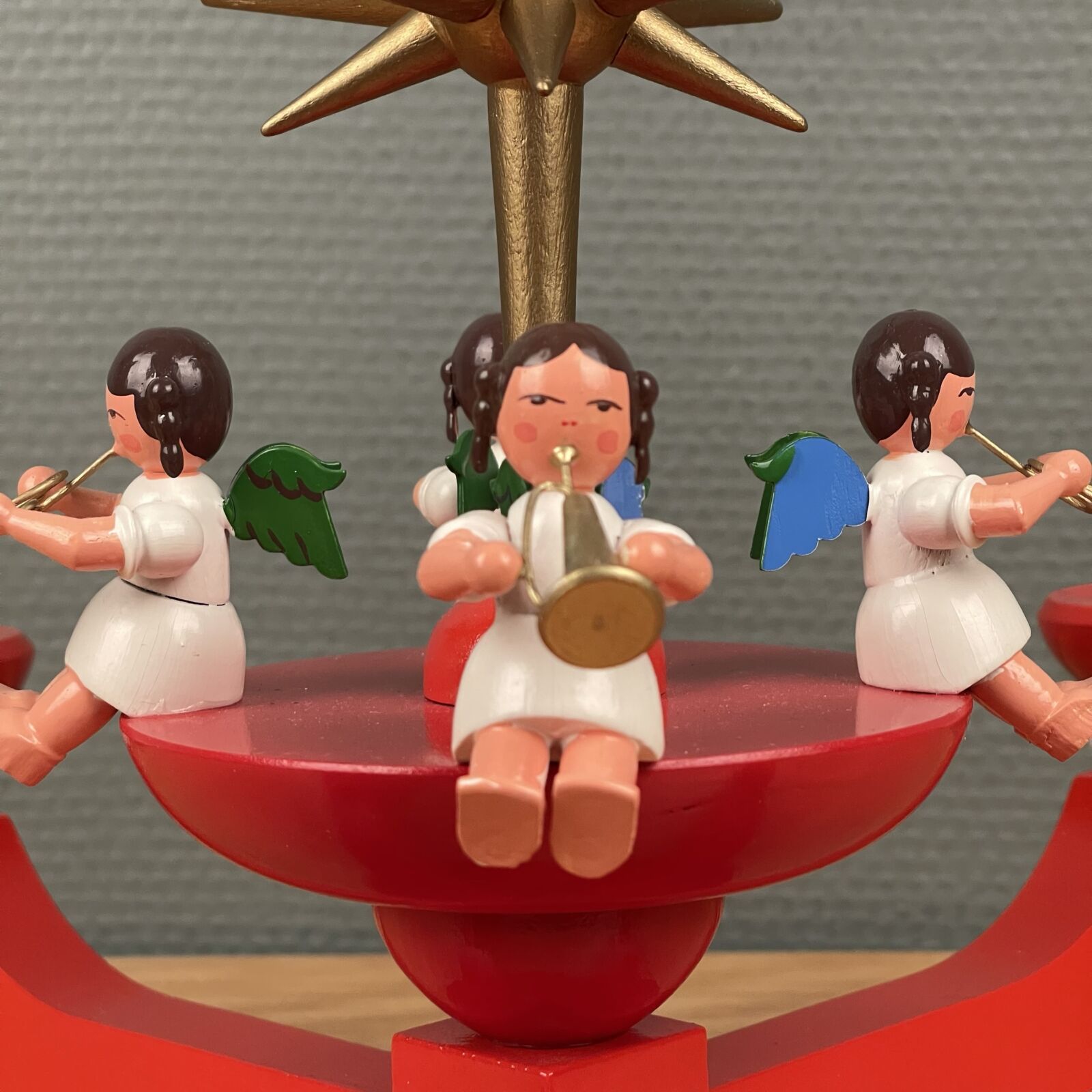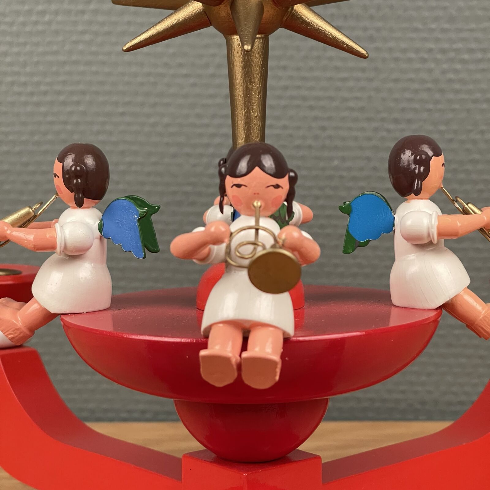 Wendt & Kühn / Erzgebirge advent stage. Med 4 engle og stor topstjerne. Fremstår som ny og i original æske. Måler 37cm Ø. 25cm høj.